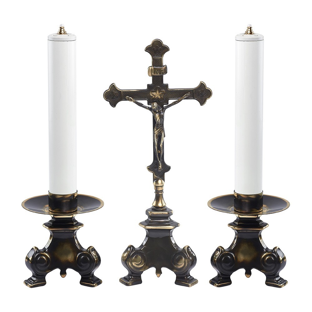 Trittico completo per altare. Questo set è realizzato in ottone anticato ed è completo di croce per altare, 2 candelieri con finte candele.
