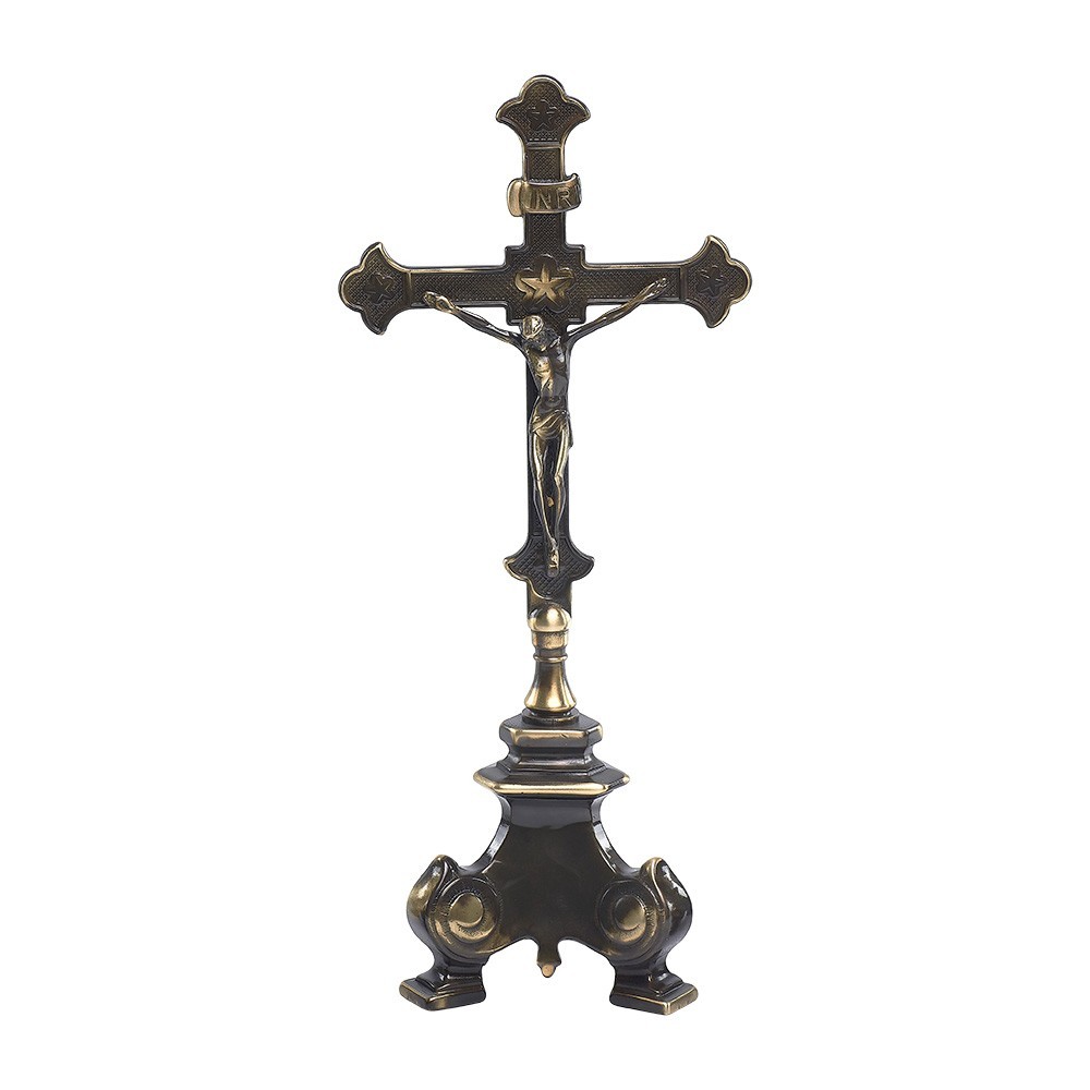 Croce da mensa in ottone con smalto rosso, h 32 cm.