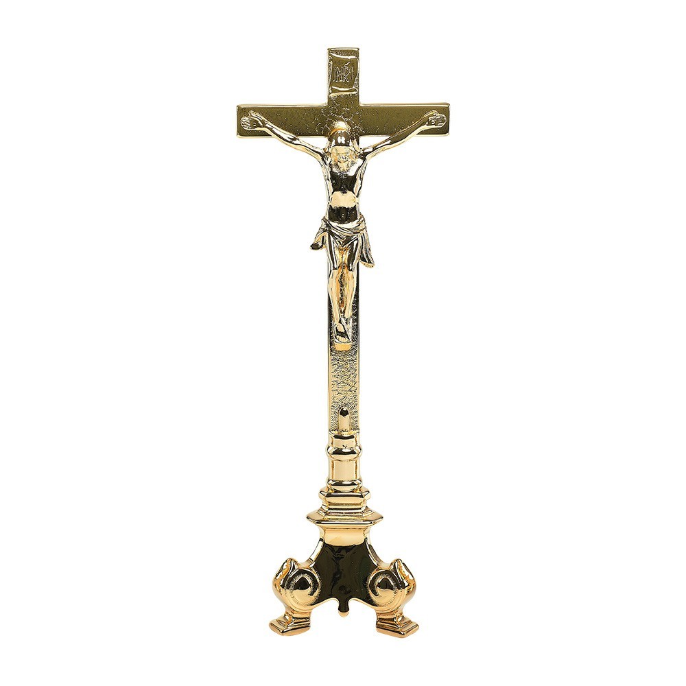 Croce su candeliere da altare in ottone dorato.
