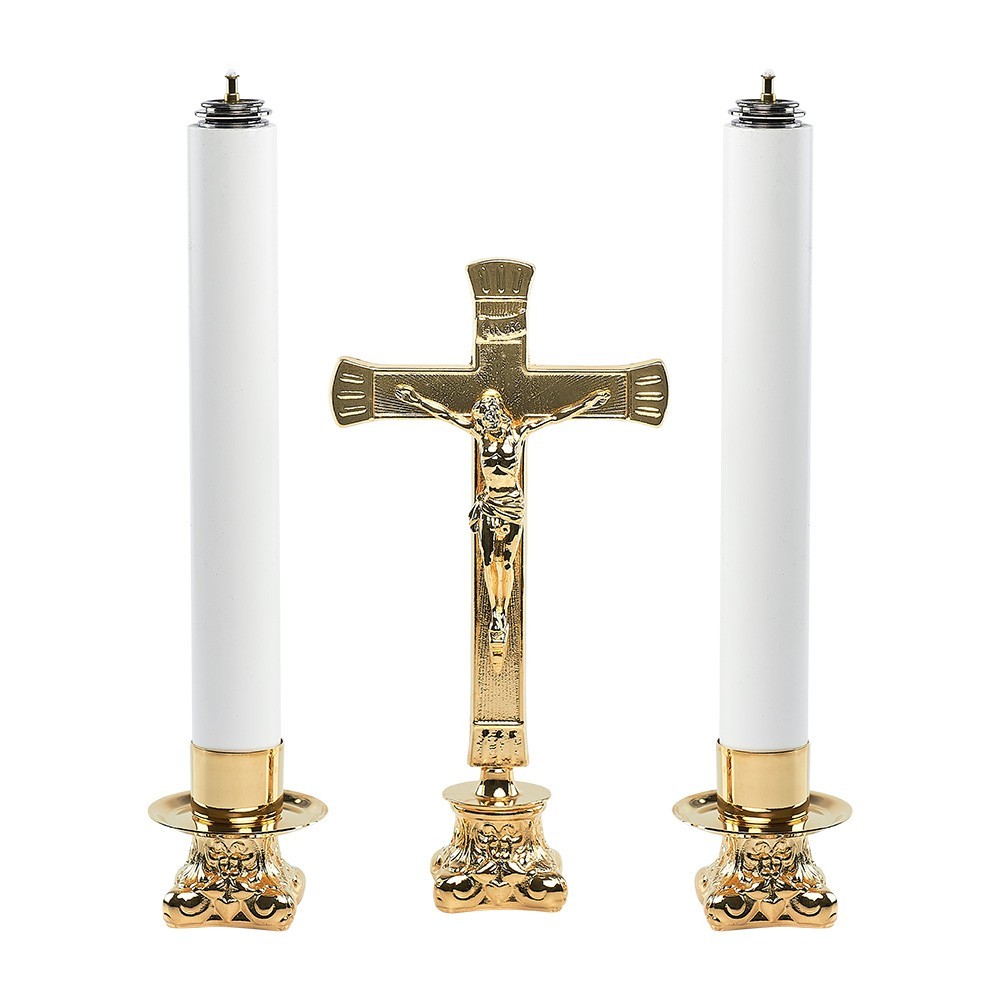 Set completo composto da croce, candelieri e finte candele. Realizzato in ottone con finitura oro.