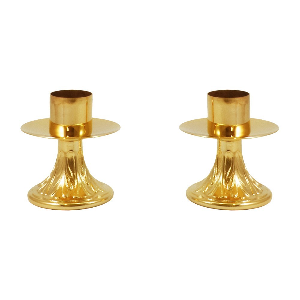 Consegna in 2 settimaneCoppia di candelieri da altare in ottone dorato, h 10 cm.
