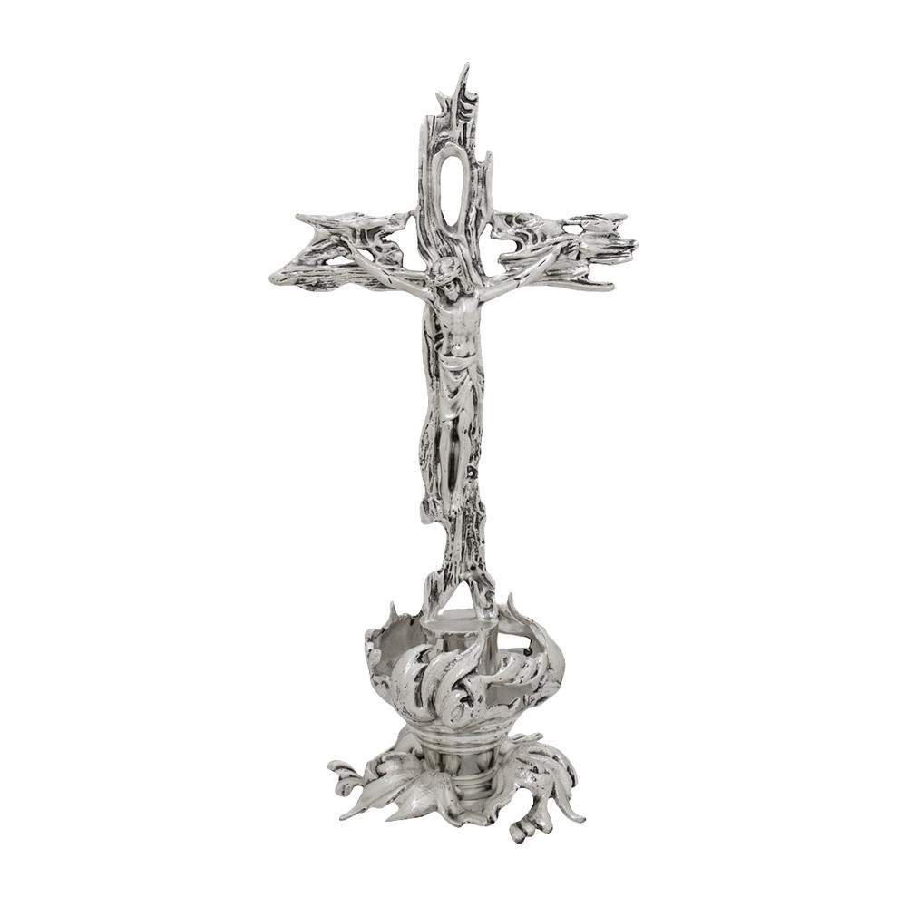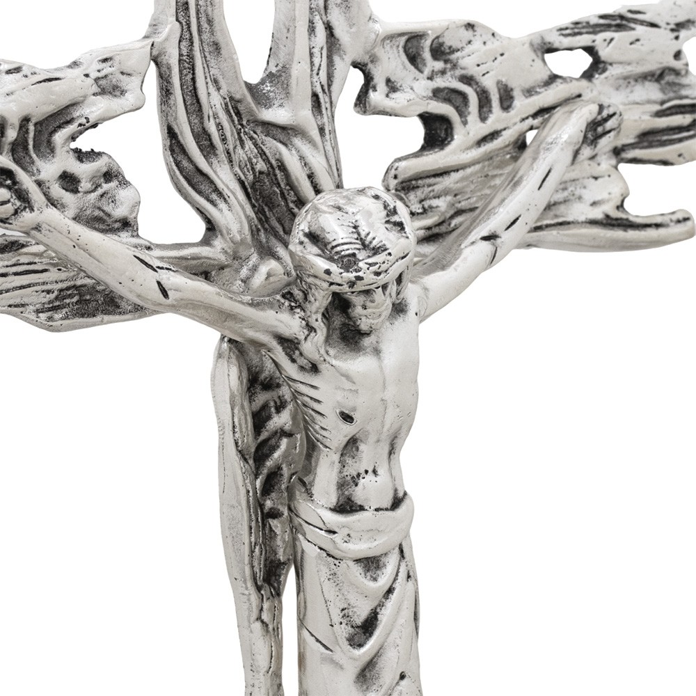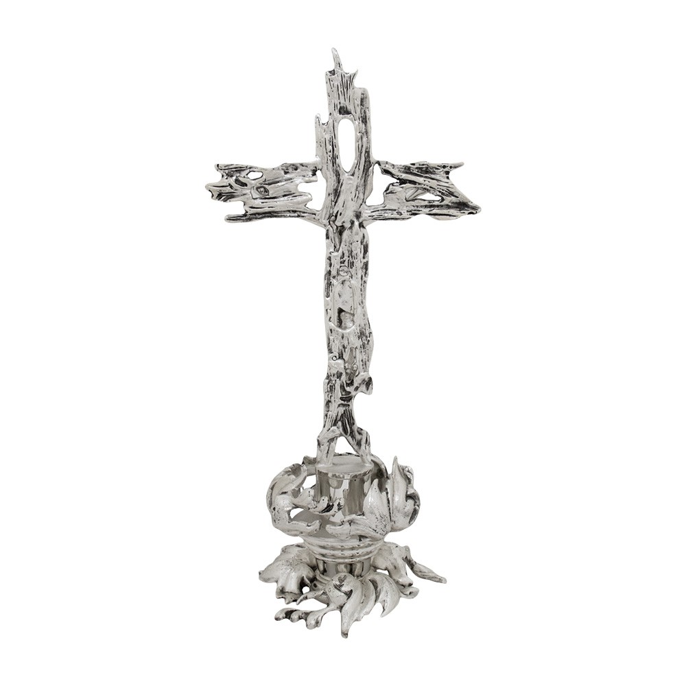 Crocifisso da altare decorato con foglie, realizzato interamente in fusione di ottone con finitura argento.