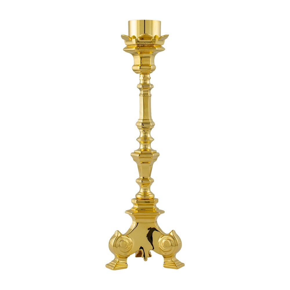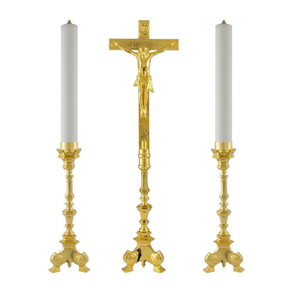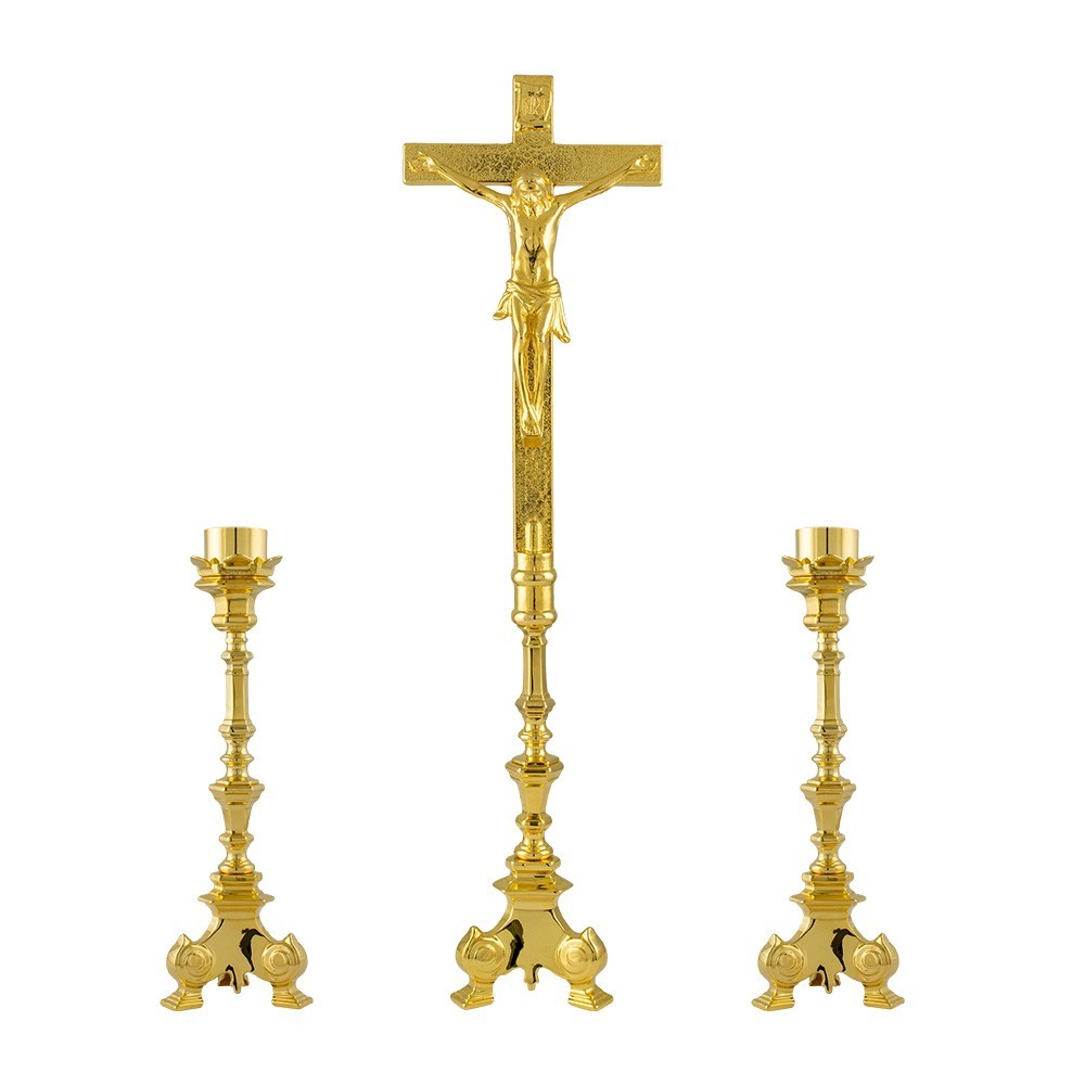 Completo da Altare in stile Barocco composto da 3 pezzi. Completo di croce + 2 Candelieri realizzati in ottone dorato. La croce è posta sul candeliere con altezza massima di 57 cm. I candelieri sono alti 30 cm e possono contenere finte candele con bossolo dal diametro massimo di 4 cm. Le finte candele non sono incluse.