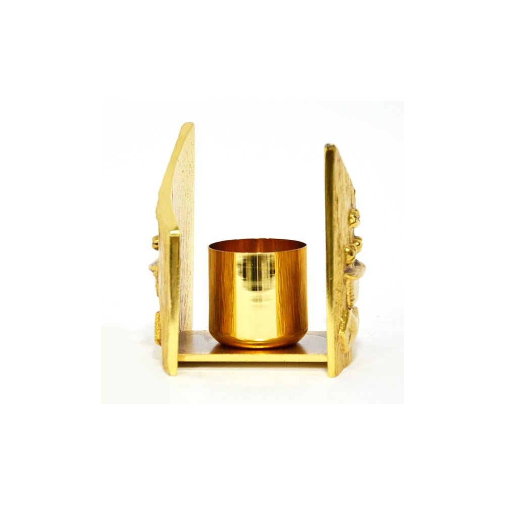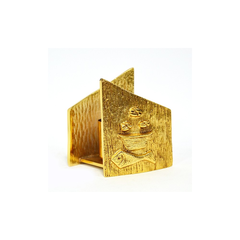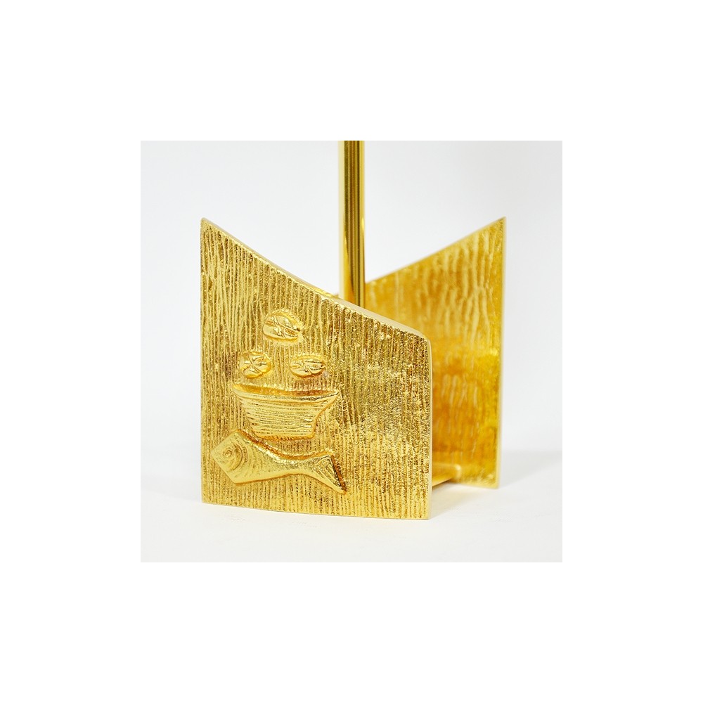 Set altare 2 candelieri + croce abbinata in ottone dorato con pressofusione simbolo "pane e pesci". Bossolo candele diam. 4