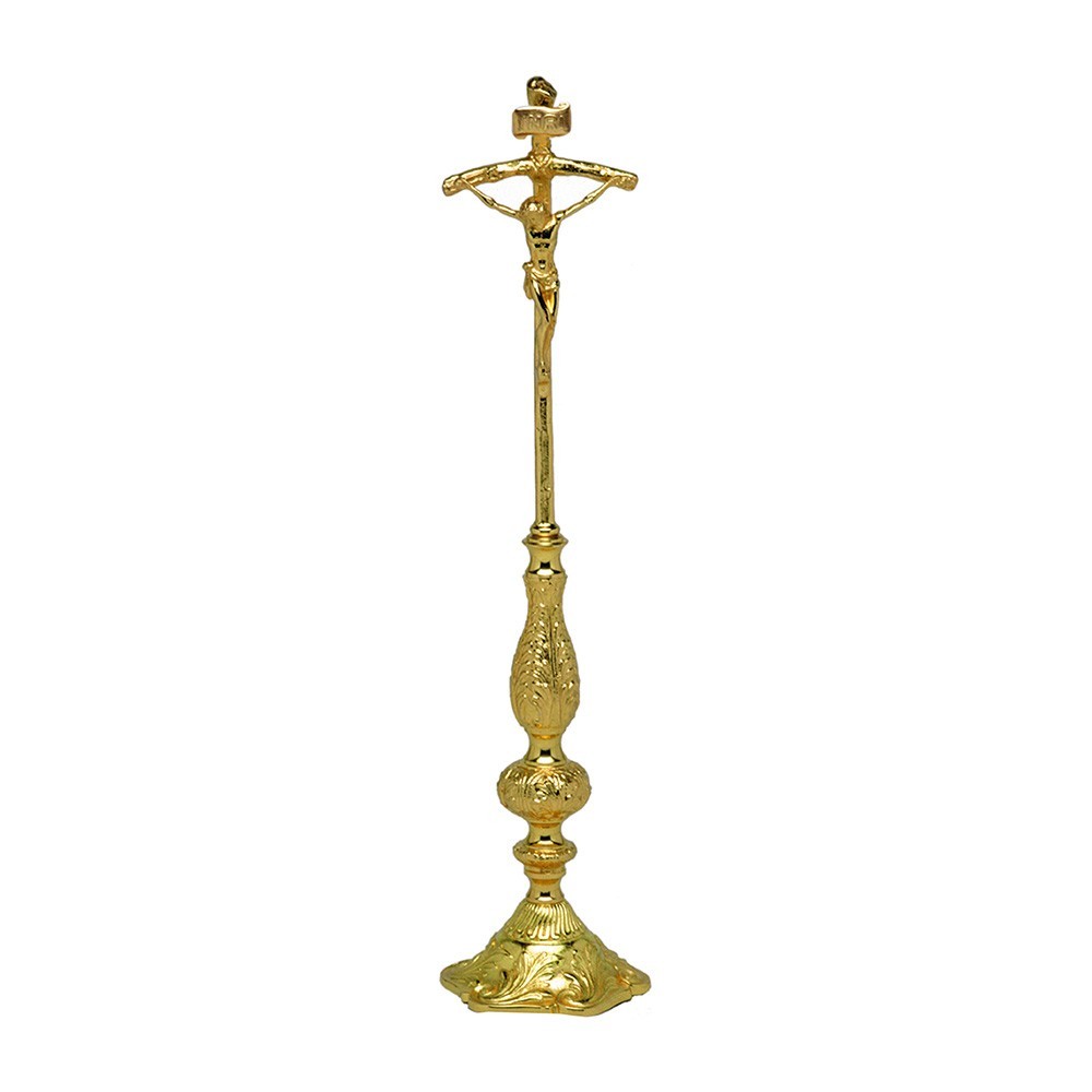 Croce da mensa per chiesa in ottone dorato. Il crocifisso è alto 48 cm. Articolo di ottima qualità, eseguito interamente in Italia, da un'azienda con grande esperienza nella lavorazione e realizzazione di arredi sacri.