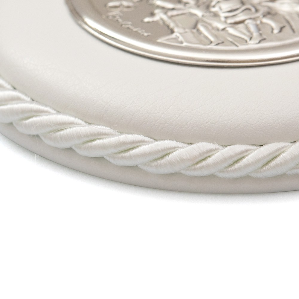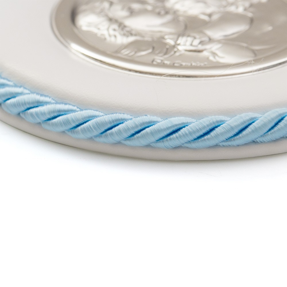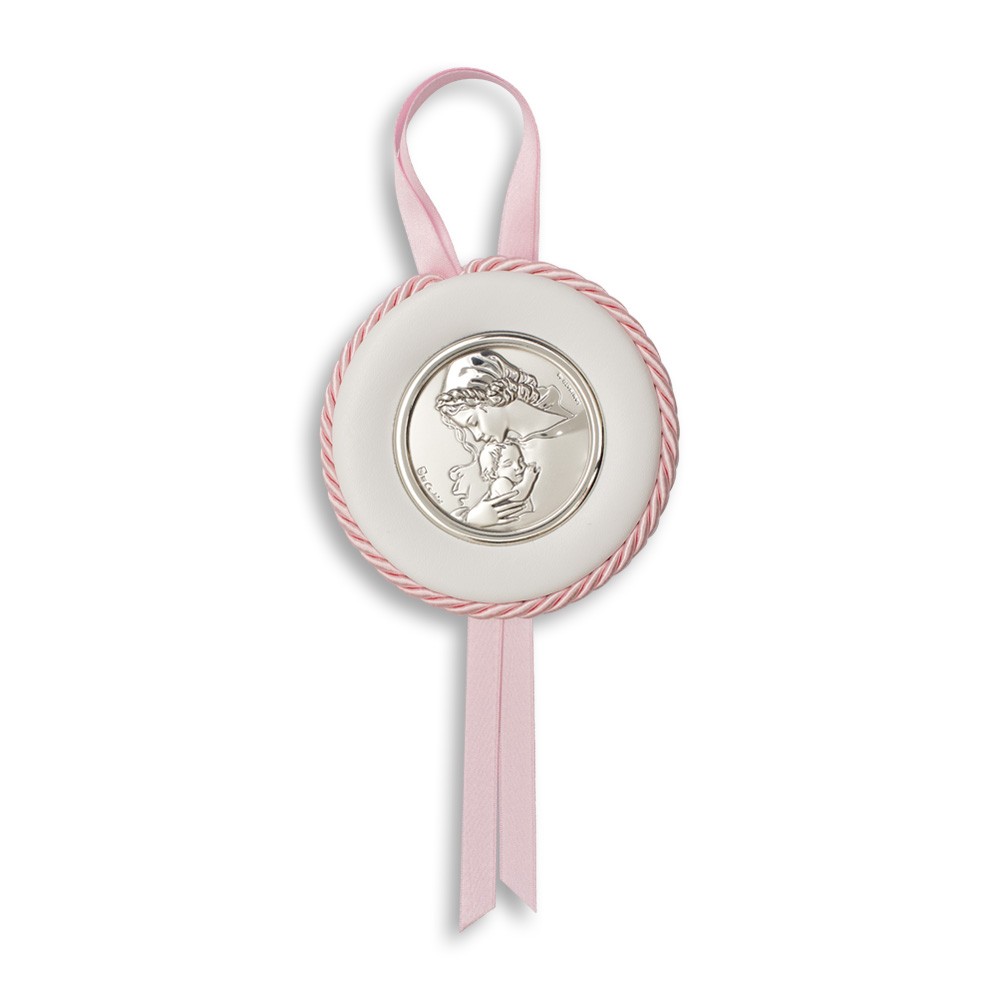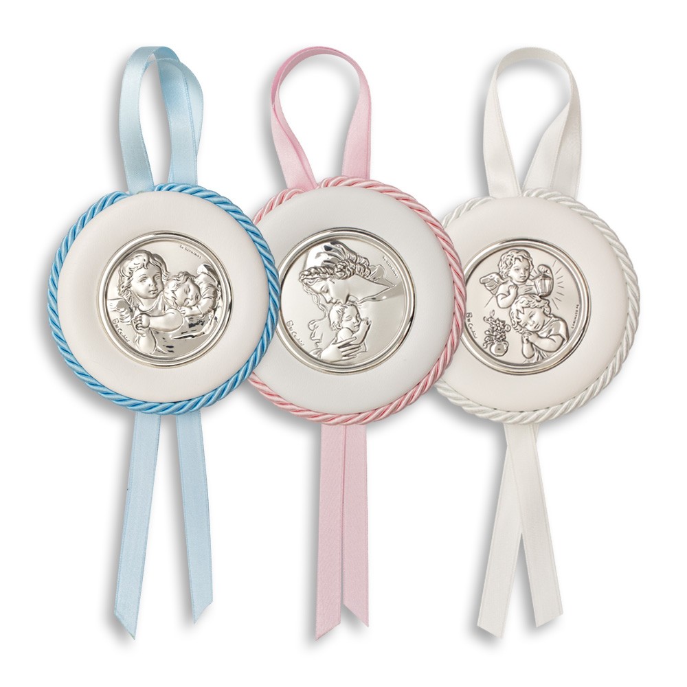 Questo grazioso sopraculla è corredato di cordoncino colorato intrecciato e placchetta con immagini in rilievo differenti ed è disponibile nelle seguenti colorazioni: