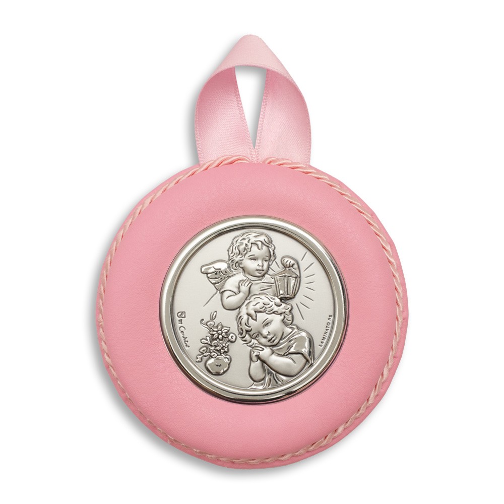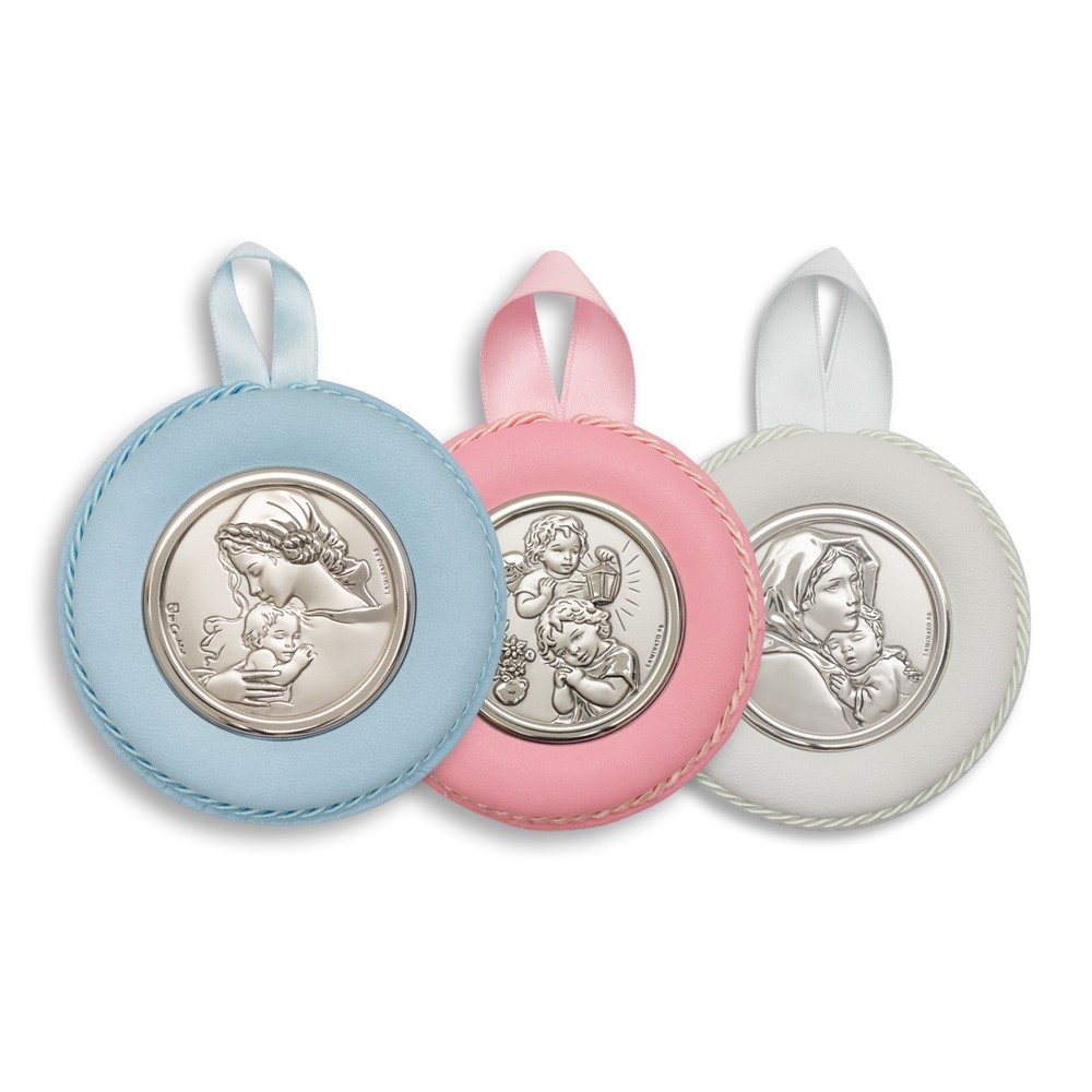 Questo capoculla è arricchito da un cordoncino intrecciato e placca con immagini in rilievo differenti.