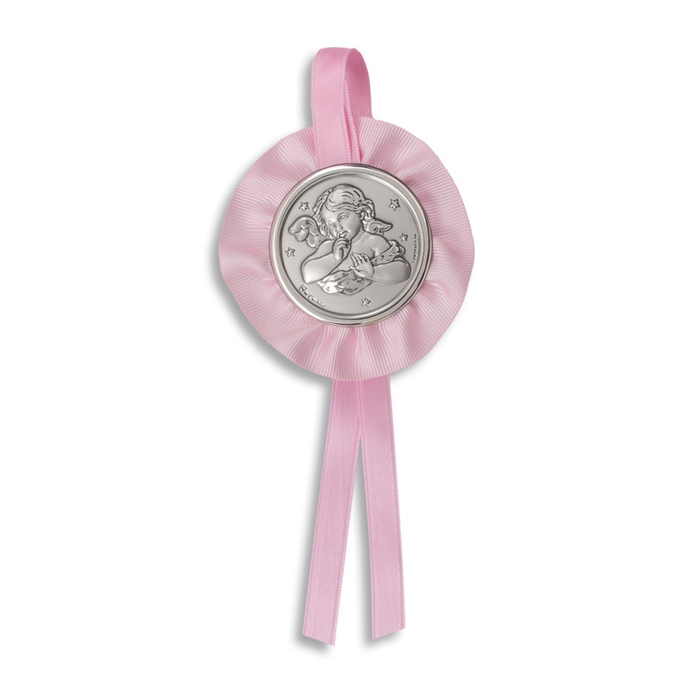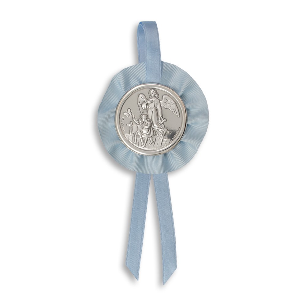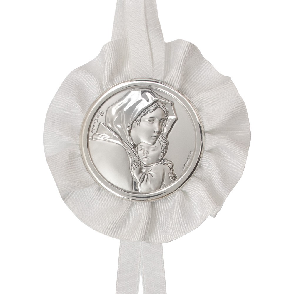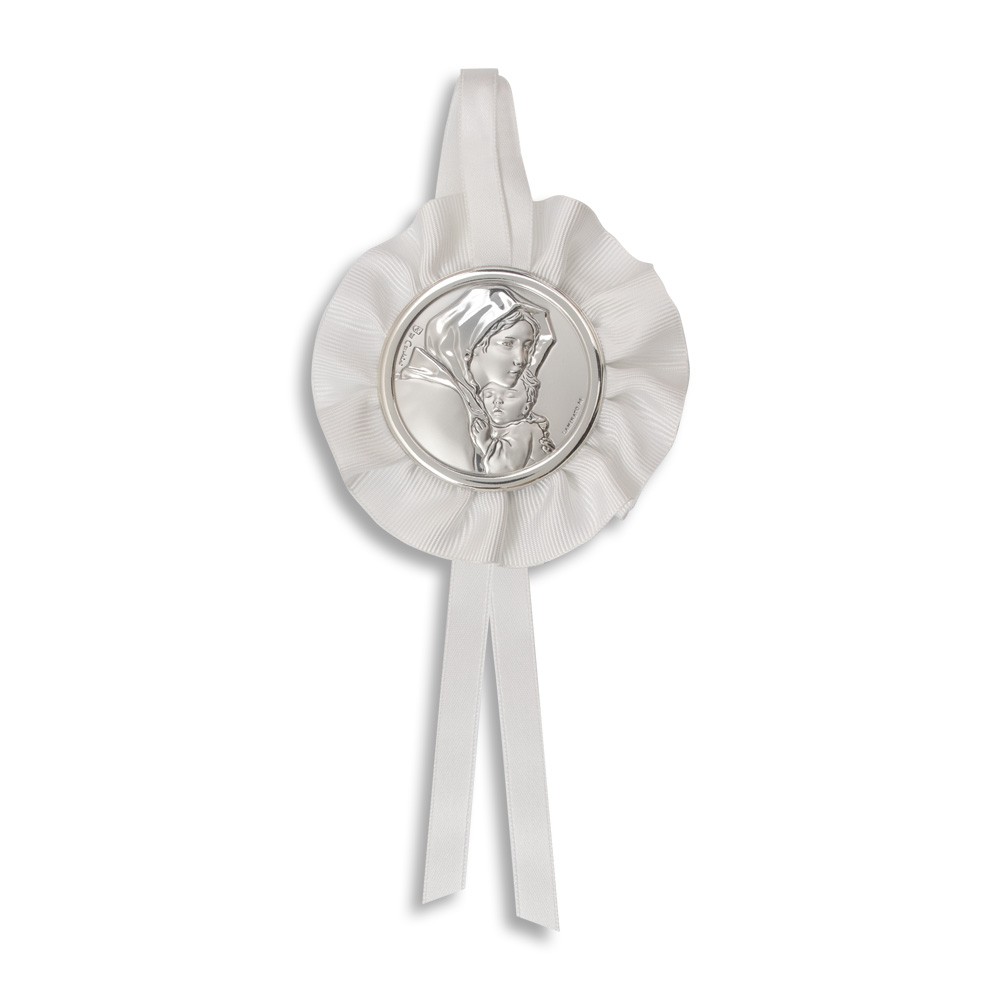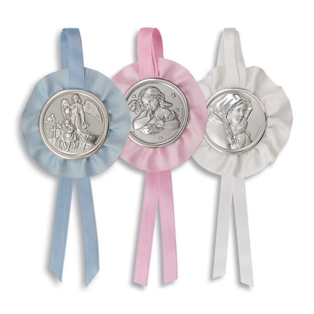 Il sopraculla è tondo orlato con nastrino abbinato, completo di placca in bilaminato argento e alluminio.