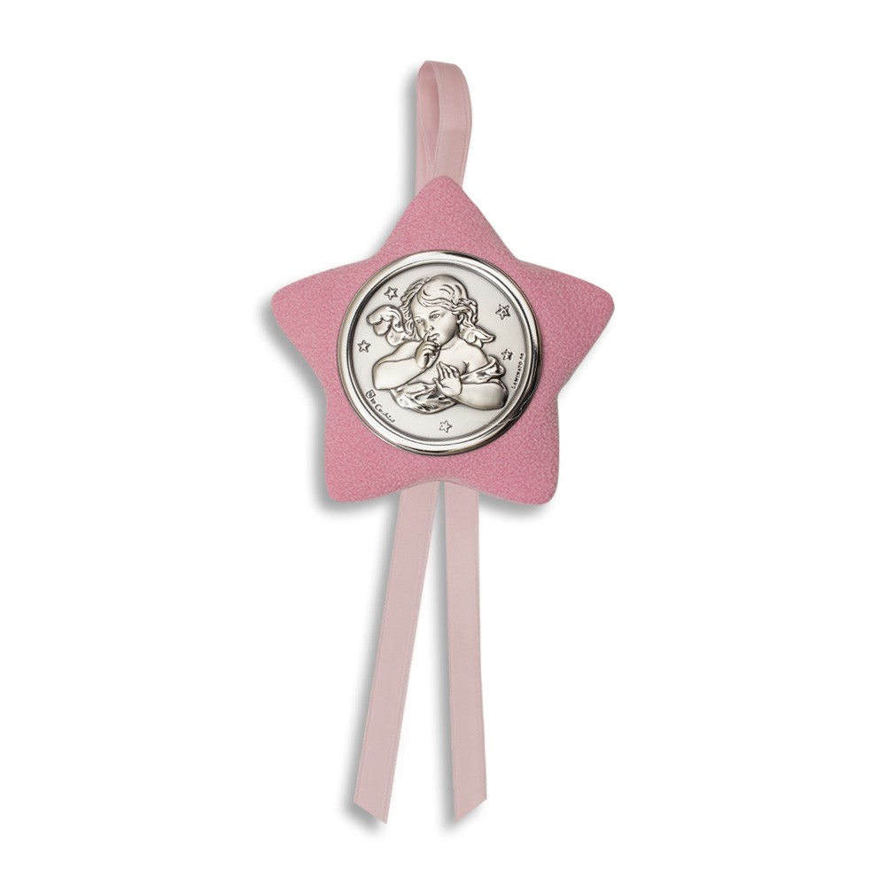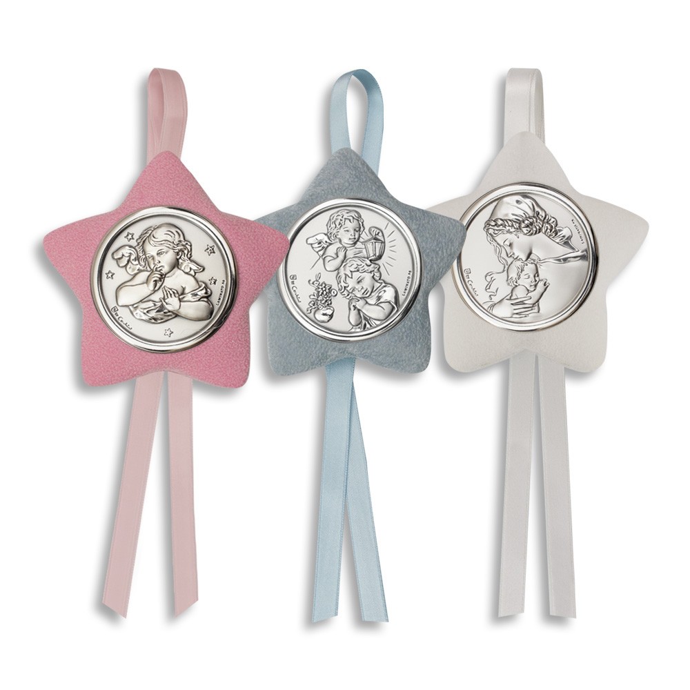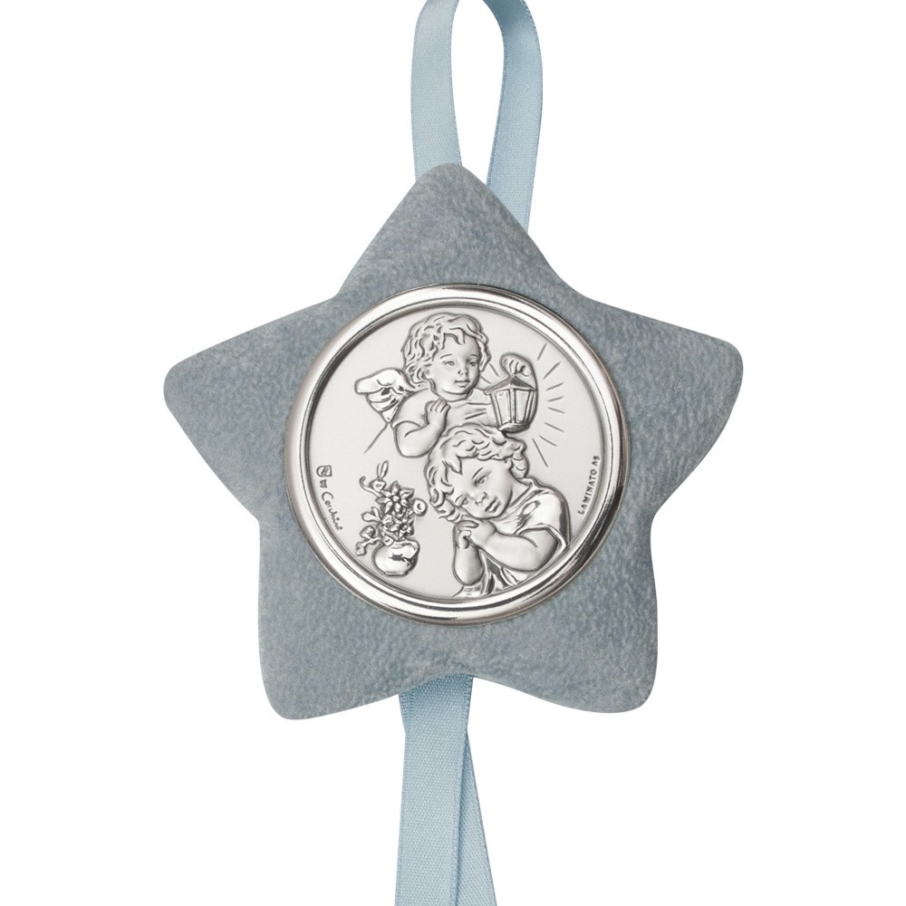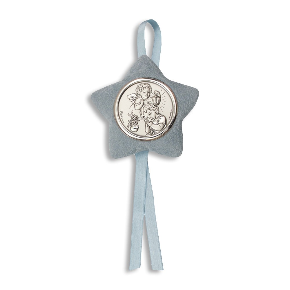 Sopraculla stella in peltro con nastro e placca con decori in rilievo.