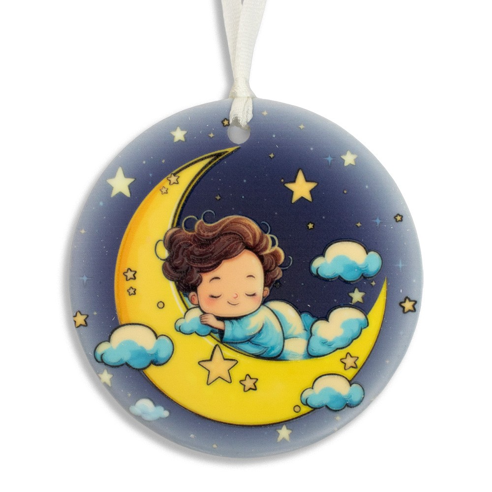 Sopraculla con immagine decorata di un grazioso angioletto sulla luna che dorme, arricchito con effetti in rilievo.