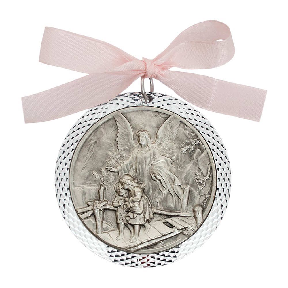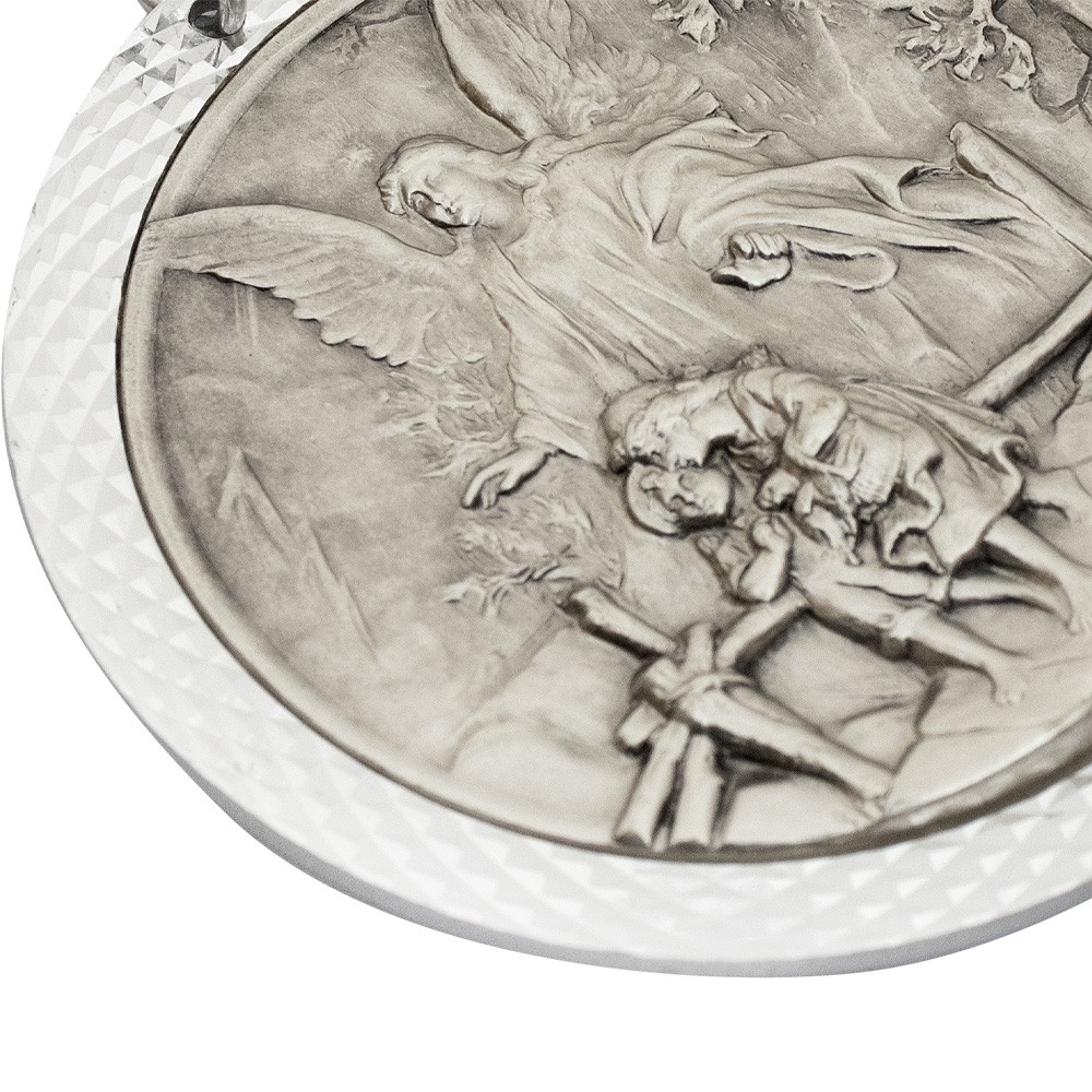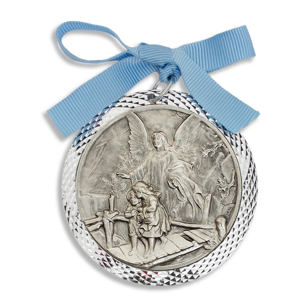 Sopraculla con nastrino colorato e immagine in rilievo dell'angelo custode con due bambini.