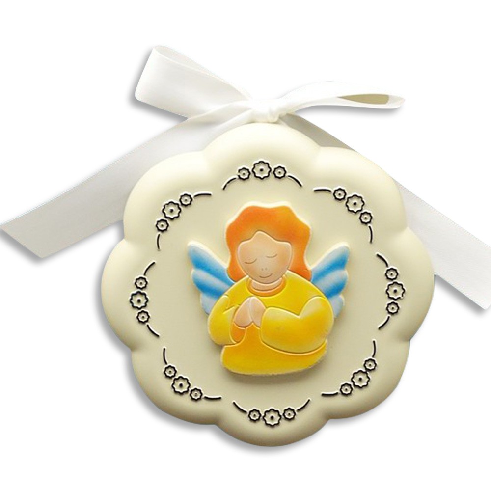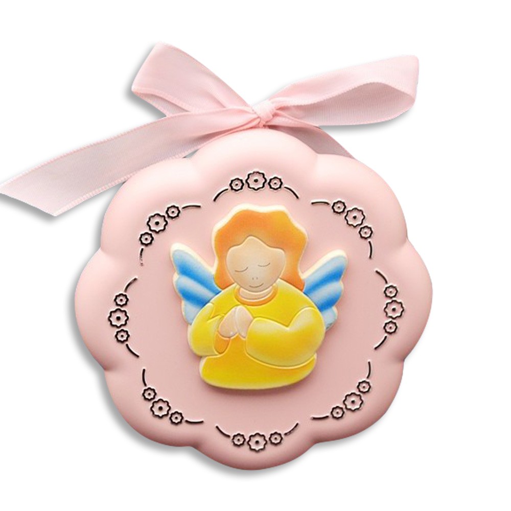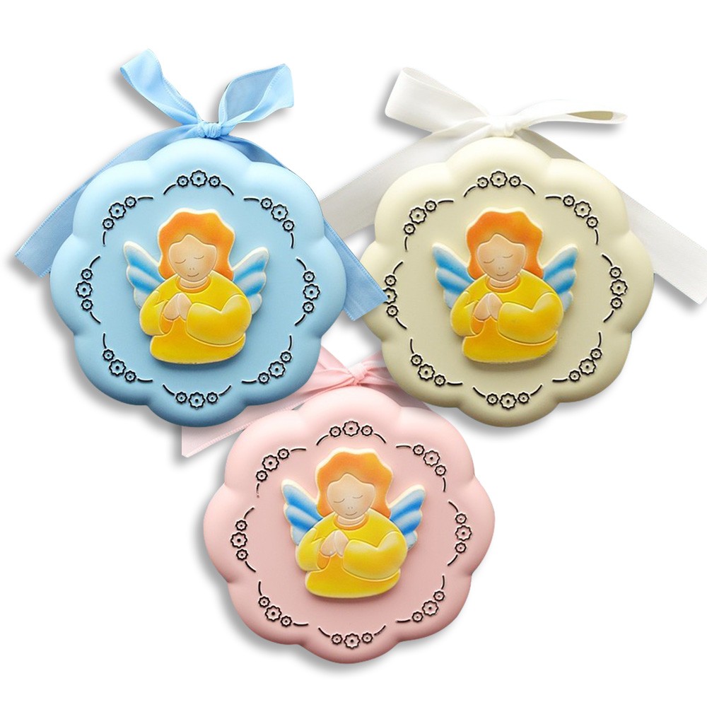 Sopraculla colorato modello FIORE effetto laccato, con decorazione in rilievo di un grazioso Angelo. Corredato di nastrino colorato e scatola. Prodotto made in Italy.