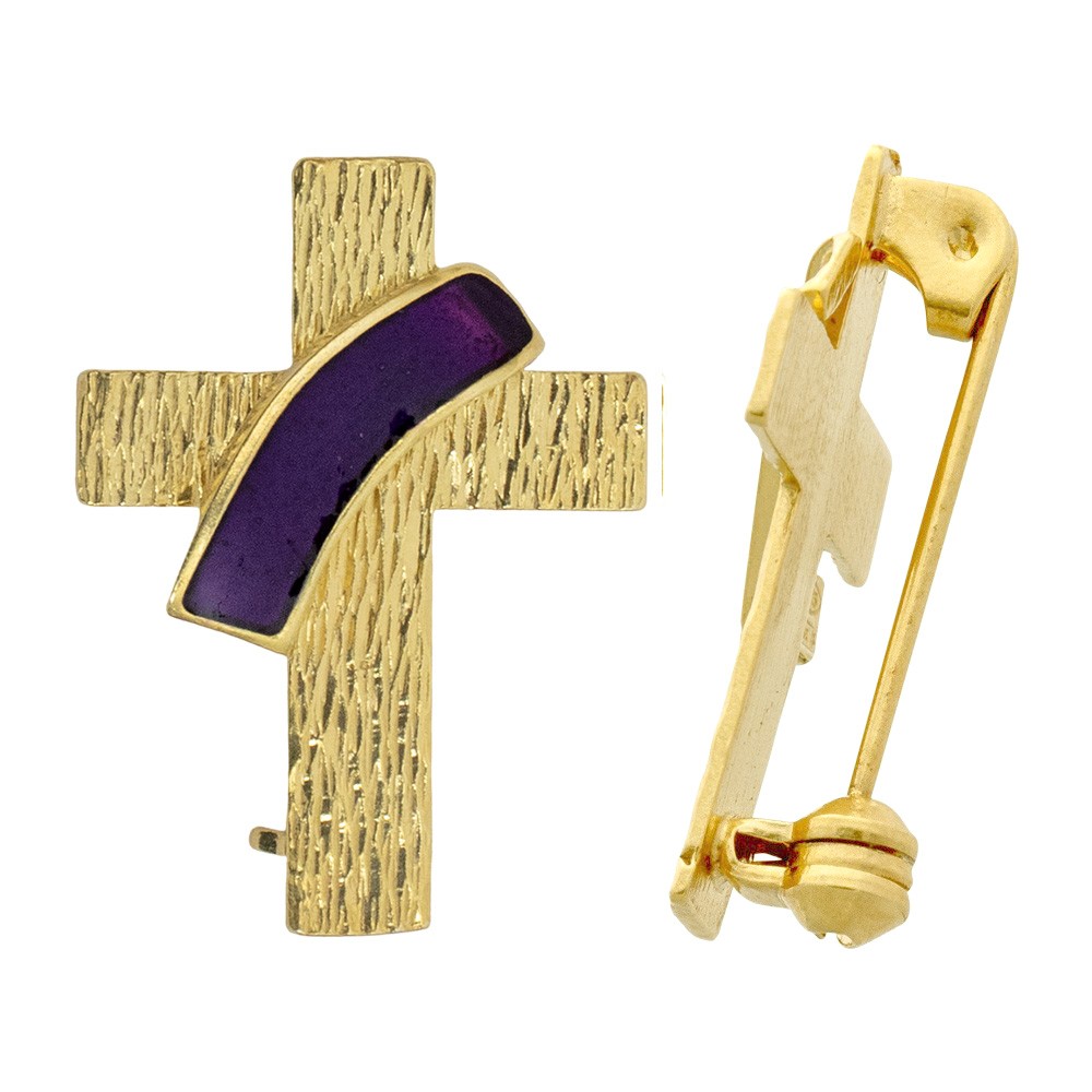 La croce è realizzata in argento 925 con finitura dorata e smaltata di colore viola. Fornita di chiusura con spilla.