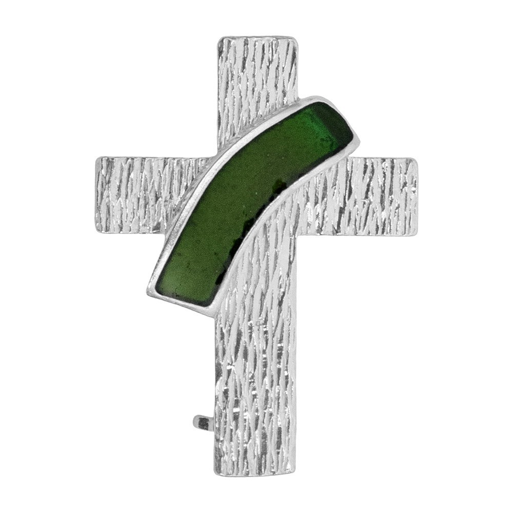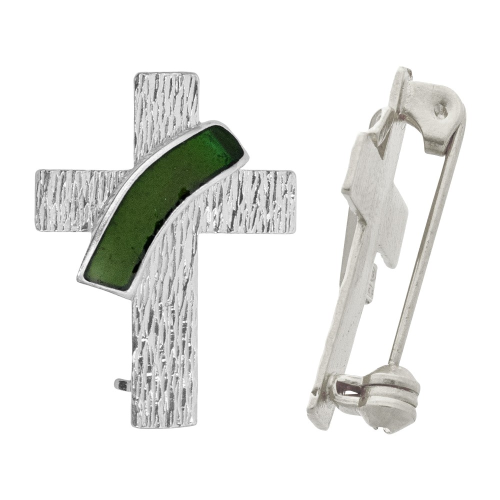 La croce è realizzata in argento 925 e smaltata verde, fornita di chiusura con spilla.