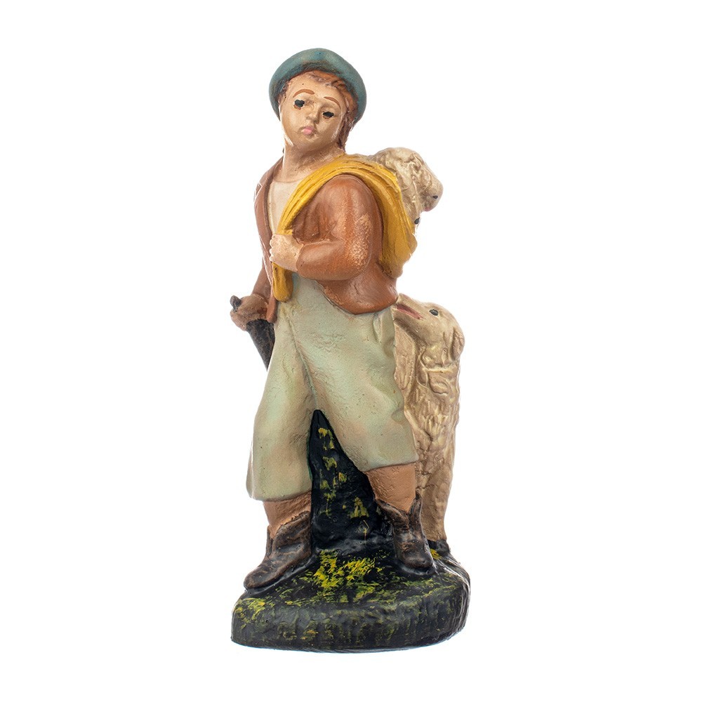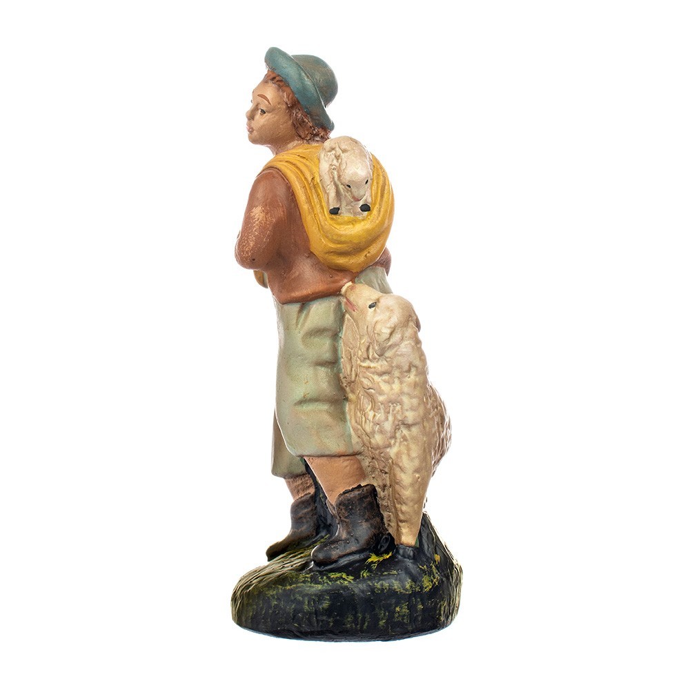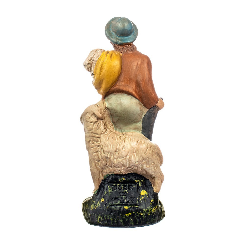 Statua in gesso: Pastore con pecore e sacco per il presepe da 15 cm. La statuetta è realizzata in gesso e dipinta interamente a mano con colorazione patinata. Prodotto dalla ditta Barsanti, fondata nel 1900 da Carmelo Barsanti che apri un laboratorio di statue di gesso specializzato in arte sacra e presepi.