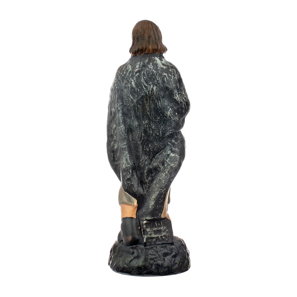 Statuina per il presepe in gesso raffigurante un pastore con cappello. Statue in gesso d'epoca, realizzate e dipinte interamente a mano con colorazione patinata. Prodotto dalla ditta Barsanti, fondata nel 1900 da Carmelo Barsanti che apri un laboratorio di statue di gesso specializzato in arte sacra e presepi.