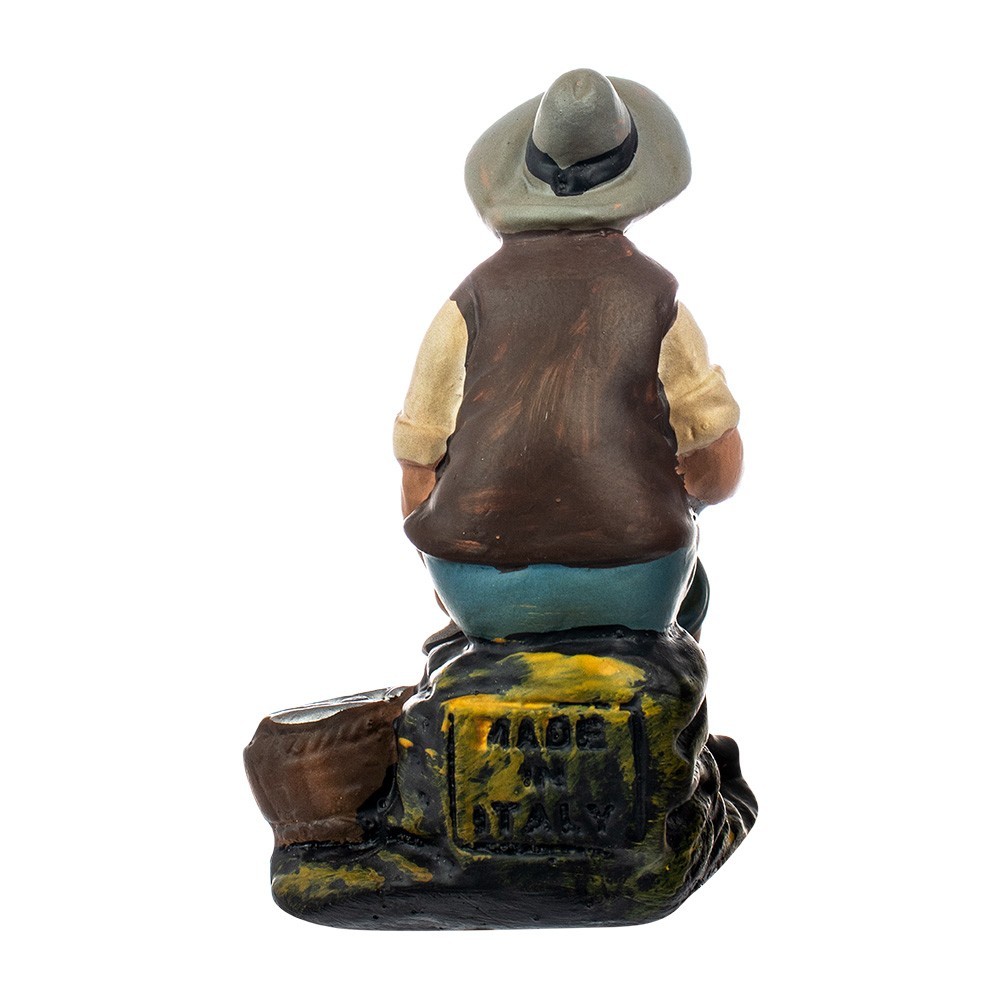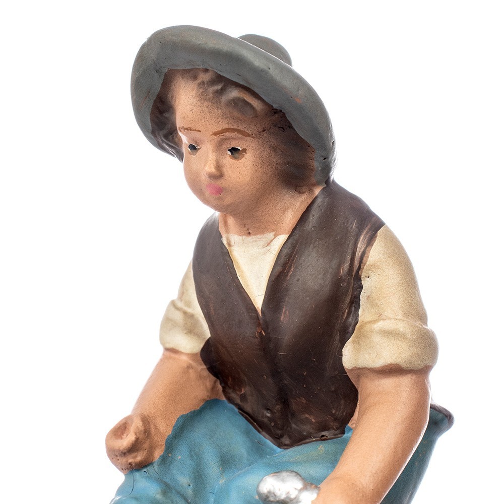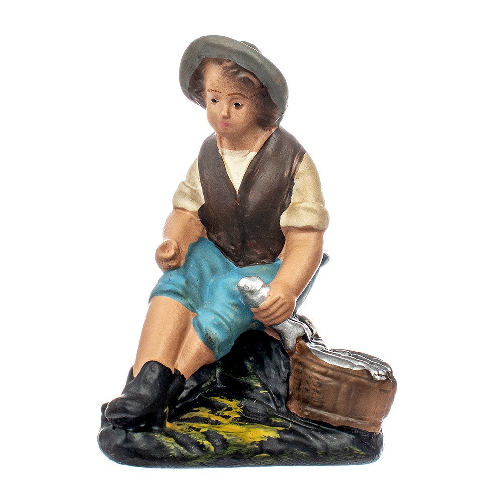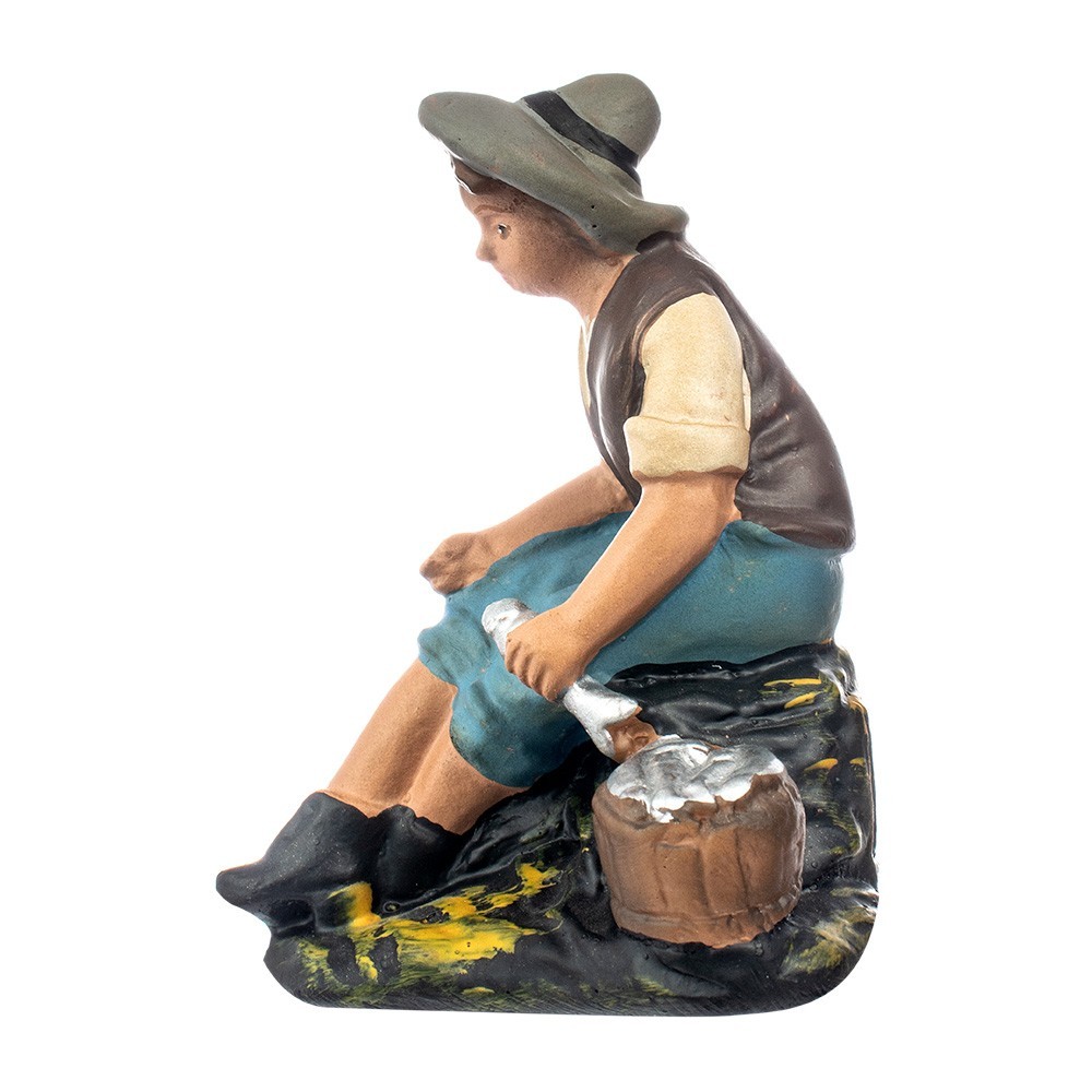 Statuina per il presepe di gesso: Pastore seduto con pesci da 15 cm. Statua in gesso d'epoca, realizzata e dipinta interamente a mano con colorazione patinata. Prodotto dalla ditta Barsanti, fondata nel 1900 da Carmelo Barsanti che apri un laboratorio di statue di gesso specializzato in arte sacra e presepi.