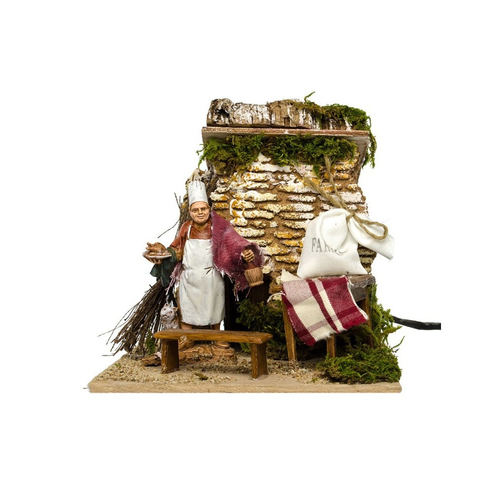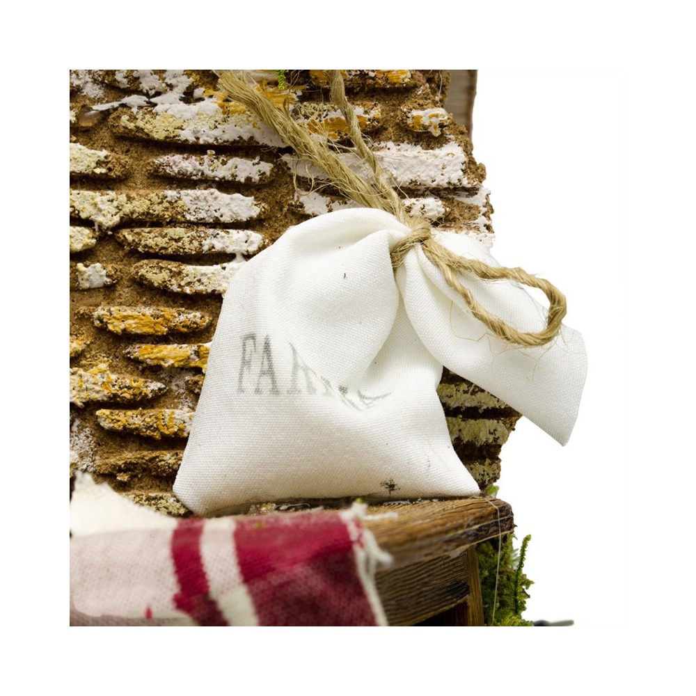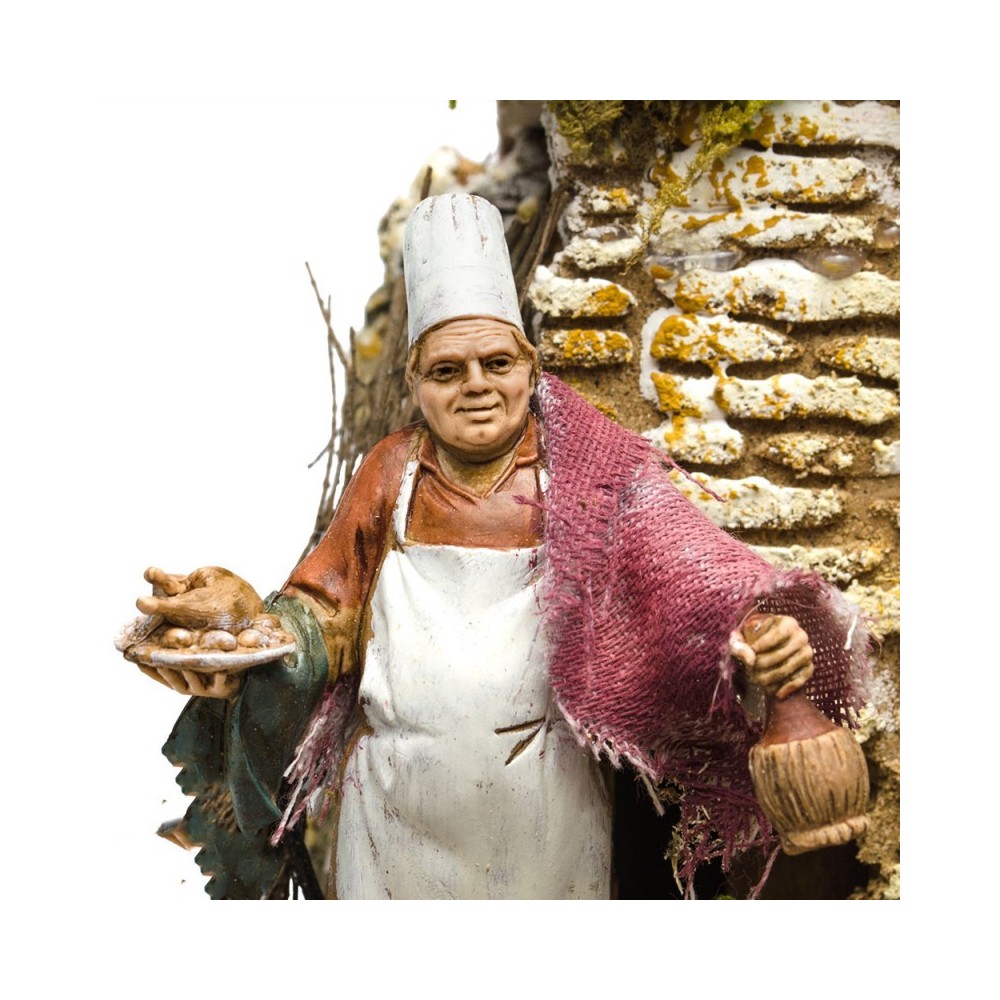 Oste che Serve ai Tavoli del Presepe Landi 10 cm. Scena del presepio in Movimento che raffigura un oste che sta servendo al tavolo una piatto ed una fiaschetta di vino. Sul tavolosi può notare anche un sacco di farina. Il motorino per il movimento è posto all'interno della struttura. Questa figura del presepe è realizzata dall ditta Moranduzzo, proprietaria del marchio Landi. Realizzata interamente in Italia.