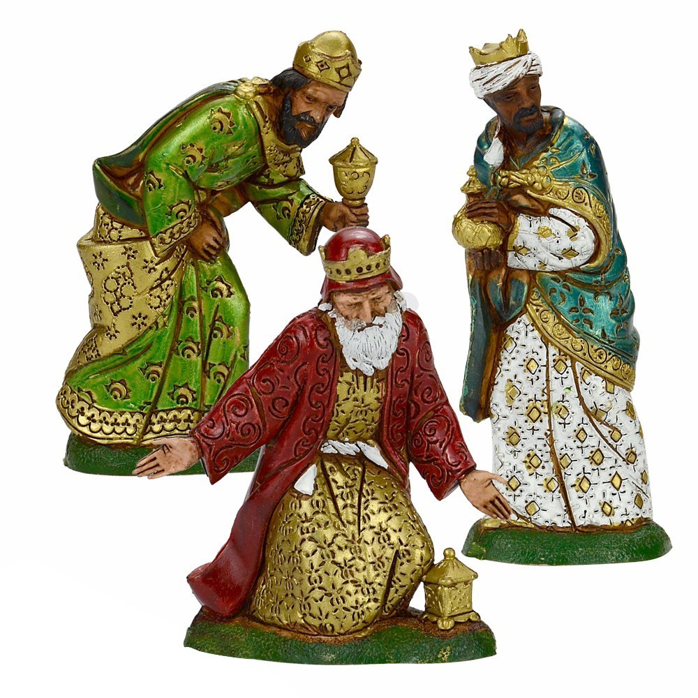 Confezione completa di tre re magi (Re Moro, Re Bianco e Re Mulatto). Le statue sono interamente in PVC, materiale leggero e infrangibile. Prodotte in Italia e dipinte a mano, avendo cura nei minimi dettagli.
