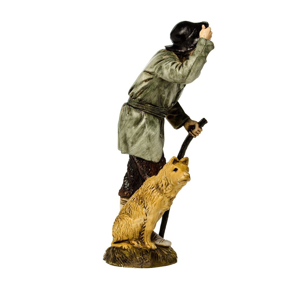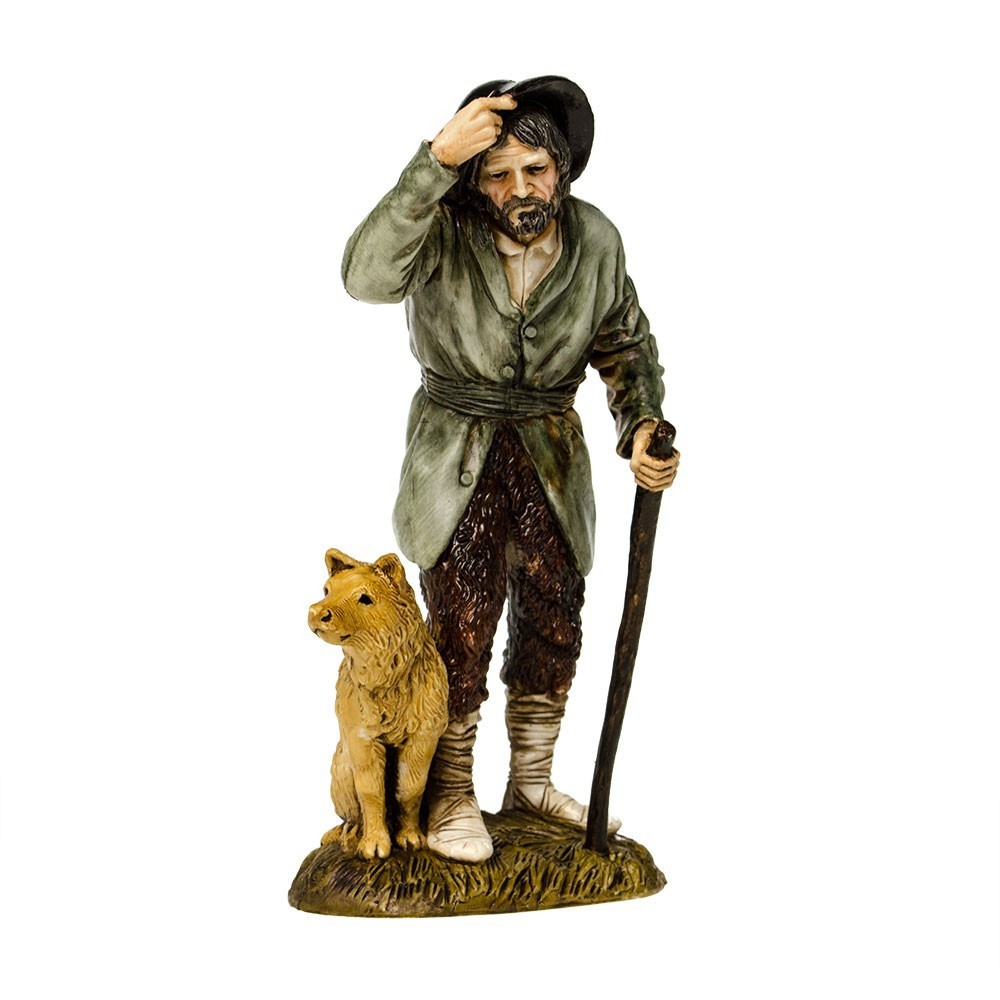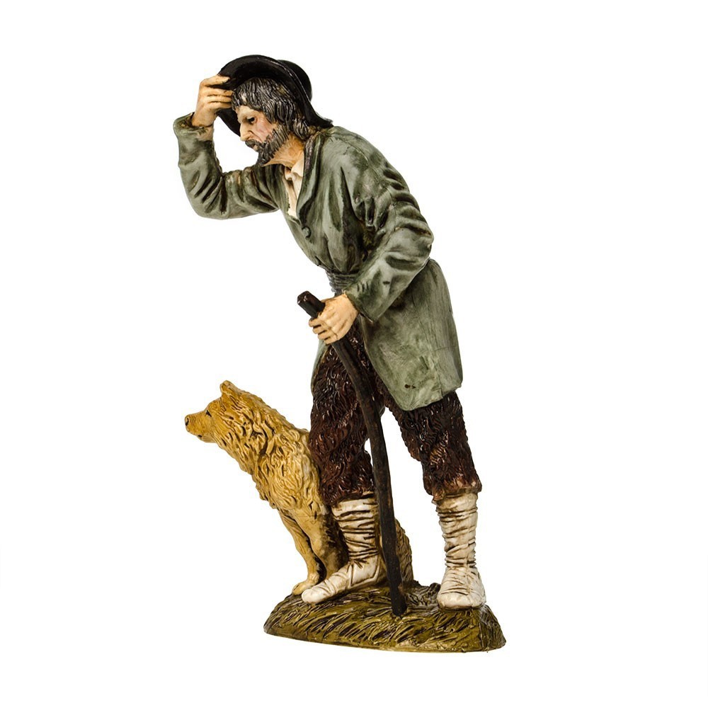 Personaggio Adorante del Presepe Landi 12 cm. Figura classica del presepio, questo pastore fa parte della collezione "Stile Settecento" della Landi. Ritrae un uomo con la barba in piedi ed appoggiato ad un bastone, mentre si toglie il cappello in segno di adorazione. Di fianco a lui un Cane seduto. Prodotto in Italia, marchio di autenticità sotto la base. Materiale utilizzato: PVC dipinto e rifinito a mano.