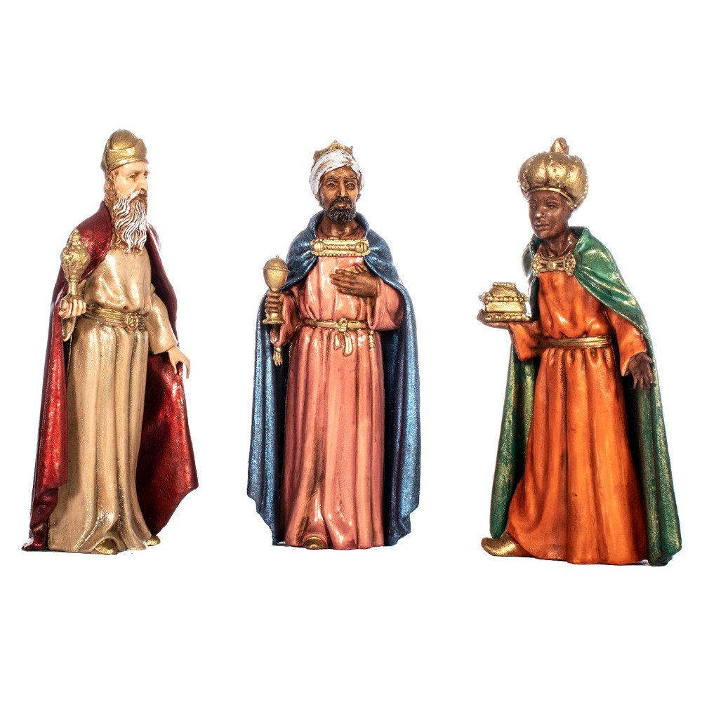 Confezione completa di tre re magi (Re Moro, Re Bianco e Re Mulatto). Le statue sono interamente in PVC, materiale leggero e infrangibile. Prodotte in Italia e dipinte a mano, avendo cura nei minimi dettagli. Le statuette sono alte 12 cm.