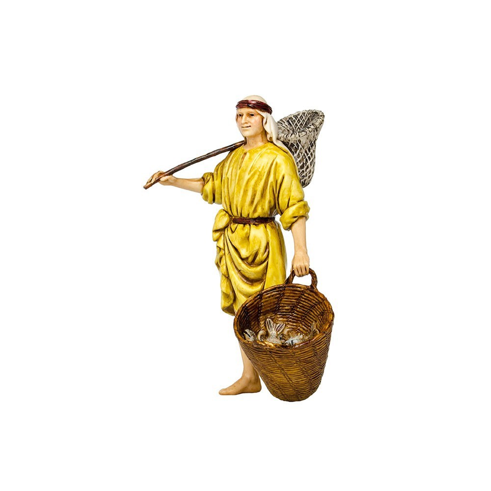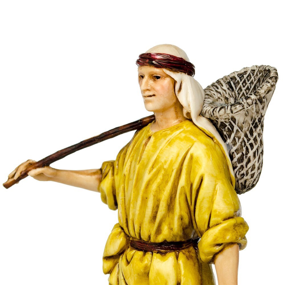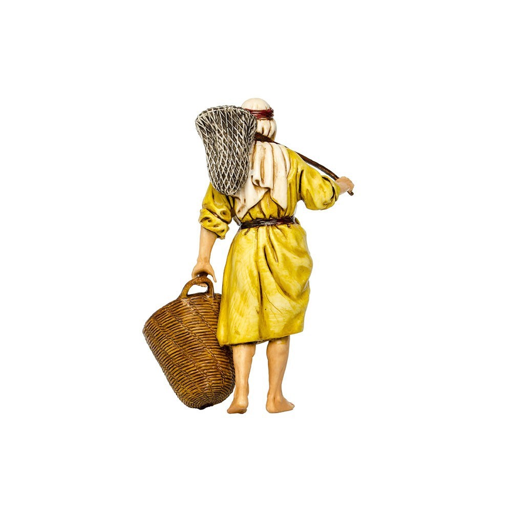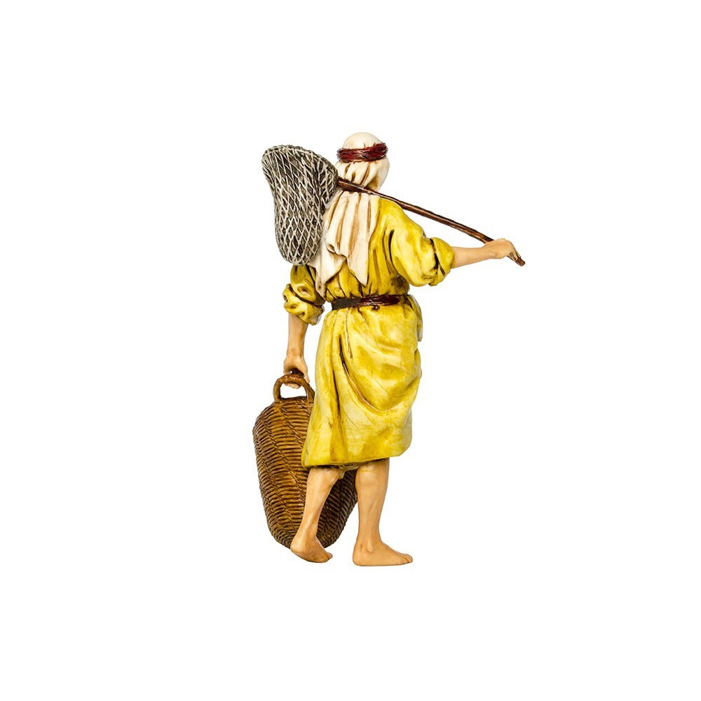 Pescatore del Presepe Landi 13 cm. Questo personaggio del presepio raffigura un uomo arabo con un cesto di pesci e il retino in spalla. Questi pastori della Landi sono senza la base, per facilitare la collocazione all'interno delle scenografie del presepe.