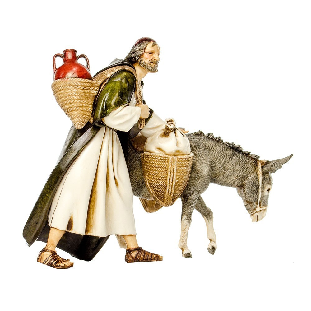Viandante con Asino per il Presepe Landi 13 cm. Personaggio particolare per il presepio che raffigura un uomo in cammino con la giara sulla spalla che si accompagna ad un asinello.