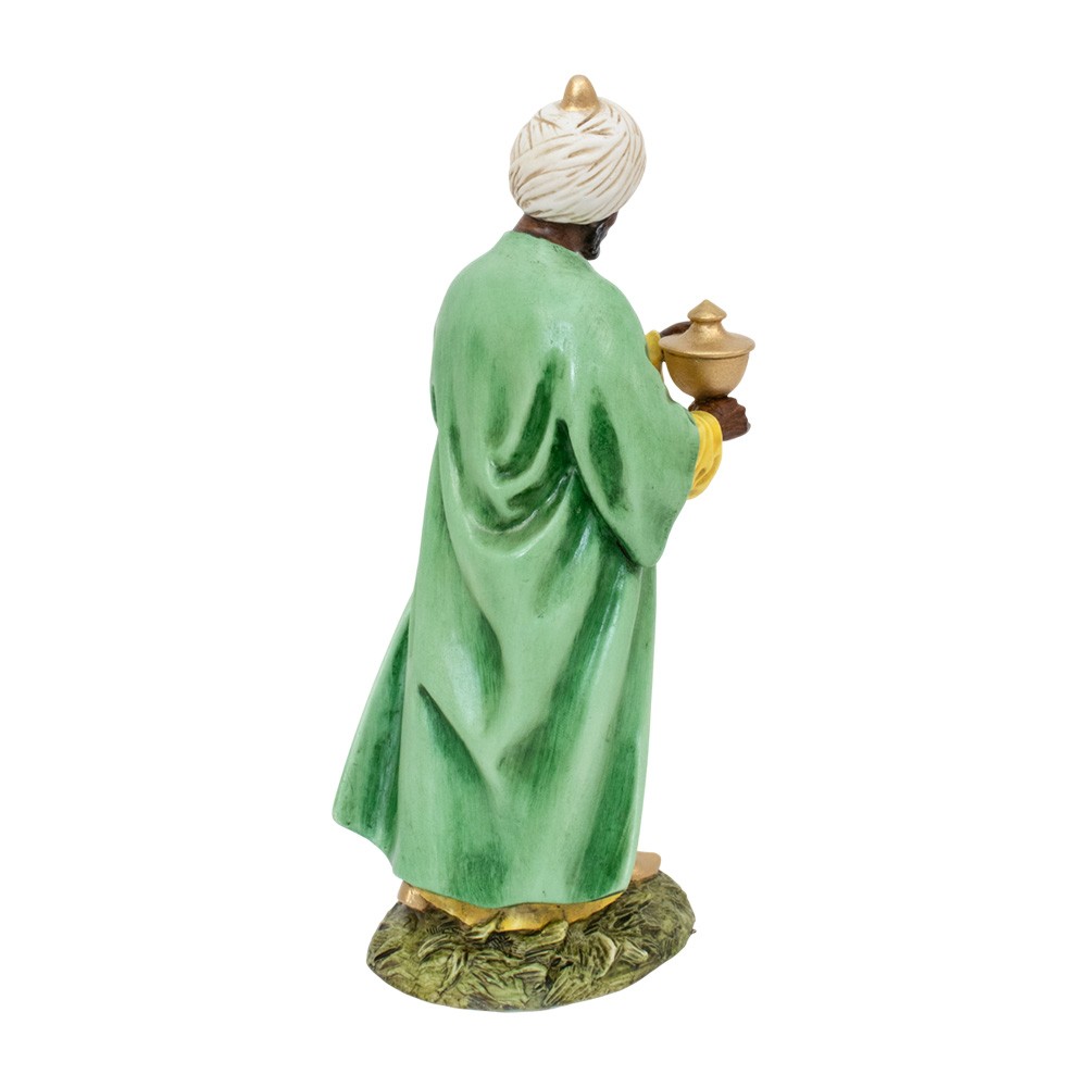 Elegante statua del Re Saraceno in resina dipinta a mano, proporzionata per il presepe con altezza 18 cm.