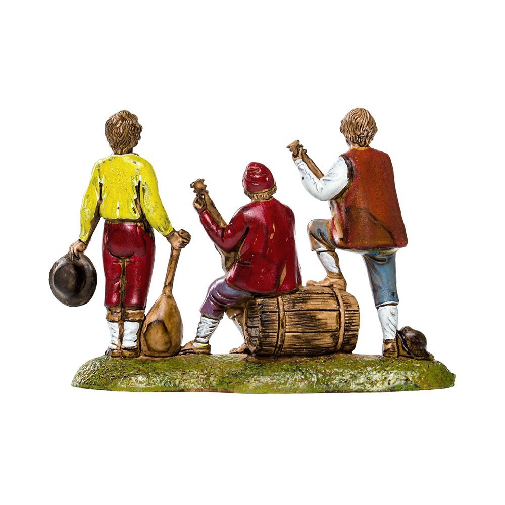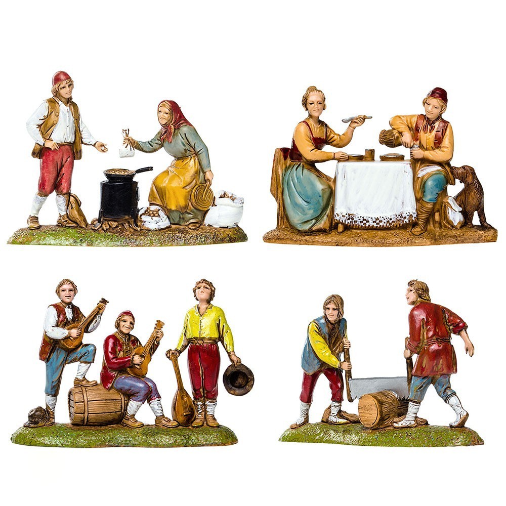 Gruppo di 4 raffigurazioni del Presepe Landi Moranduzzo da 6 cm: Tre Musicanti con strumenti, Boscaioli che segano il tronco, Caldarrostaia che vende le castagne, Coppia Uomo e Donna al tavolo dell'osteria. Sono realizzati in Italia, in PVC dipinti e rifiniti a mano, dalla ditta Moranduzzo.