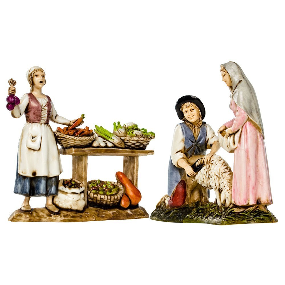 Personaggi del Presepe Moranduzzo: Fruttivendola con Banco di Frutta e Verdure e Tosatore da 8 cm con Pecorella. Questo è un Gruppo di Personaggi Mestieri. Le statue dei personaggi che lavorano sono molto realistiche e curate nei particolari, realizzate da sculture Landi.