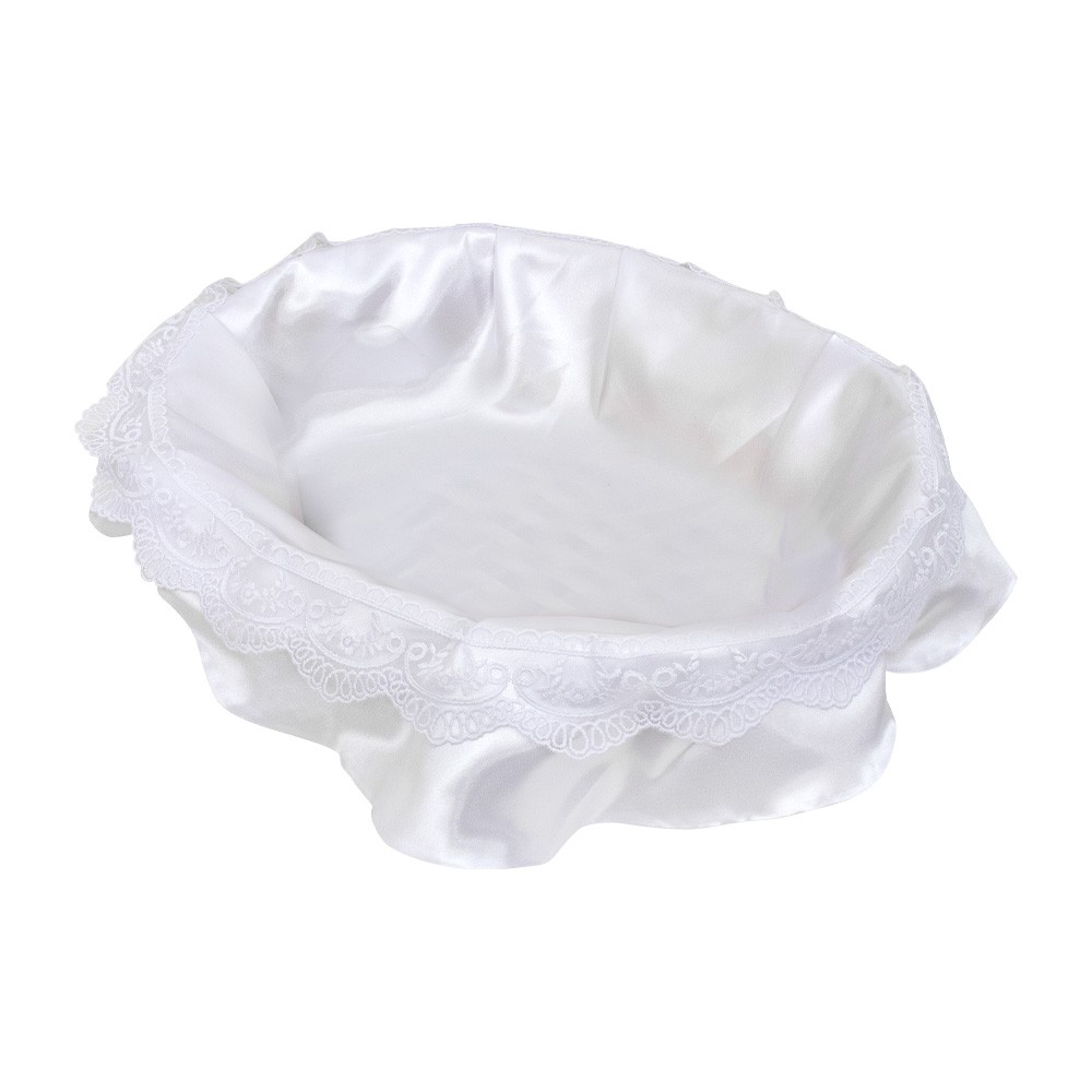 Questa culla artigianale è realizzata in vimini ed è rivestita con raso lucido e merletto.