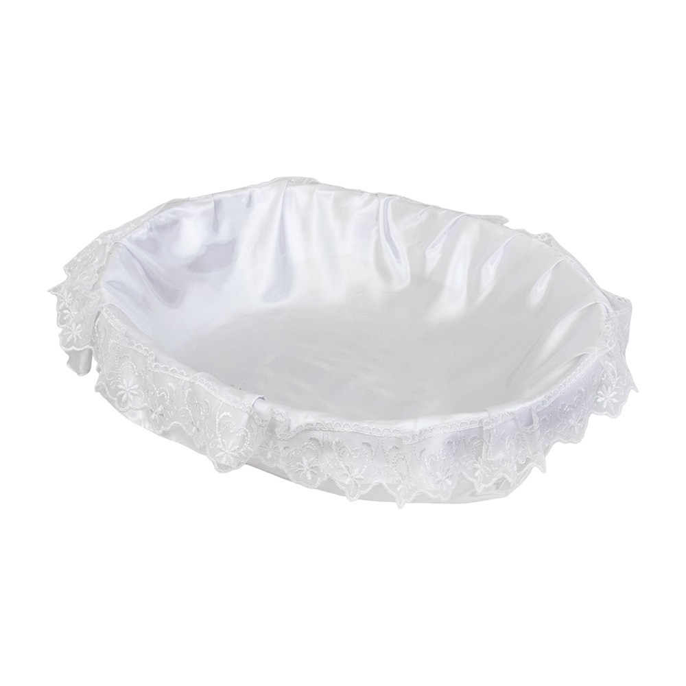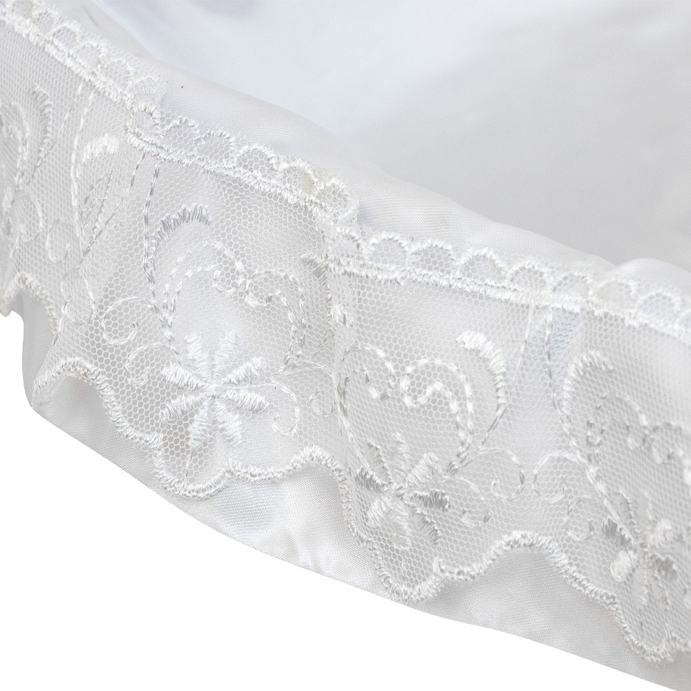 Culla artigianale realizzata in vimini e rivestita con raso lucido e merletto.