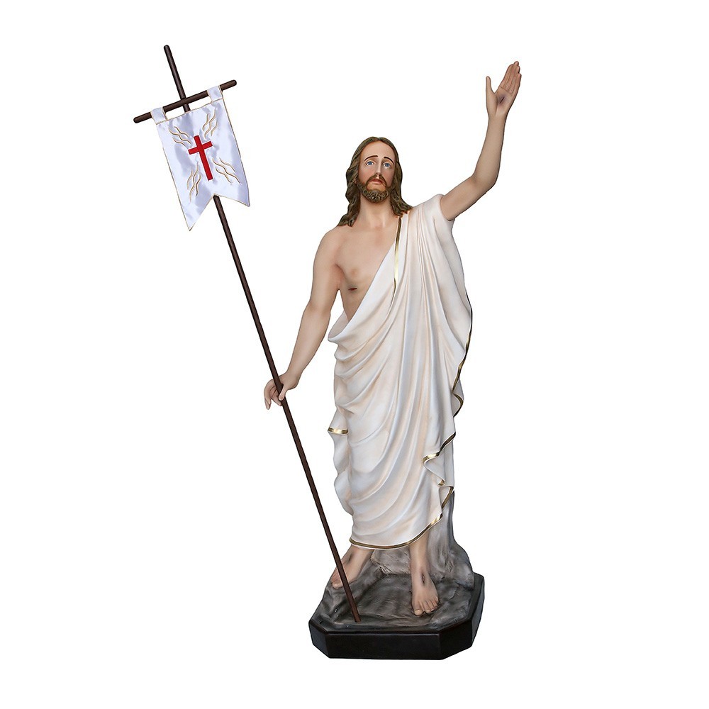 Statua in vetroresina di Gesù Risorto alta 130 cm. La statua è realizzata interamente in vetroresina è ideale per processioni ed all'interno delle chiese perchè molto leggera.