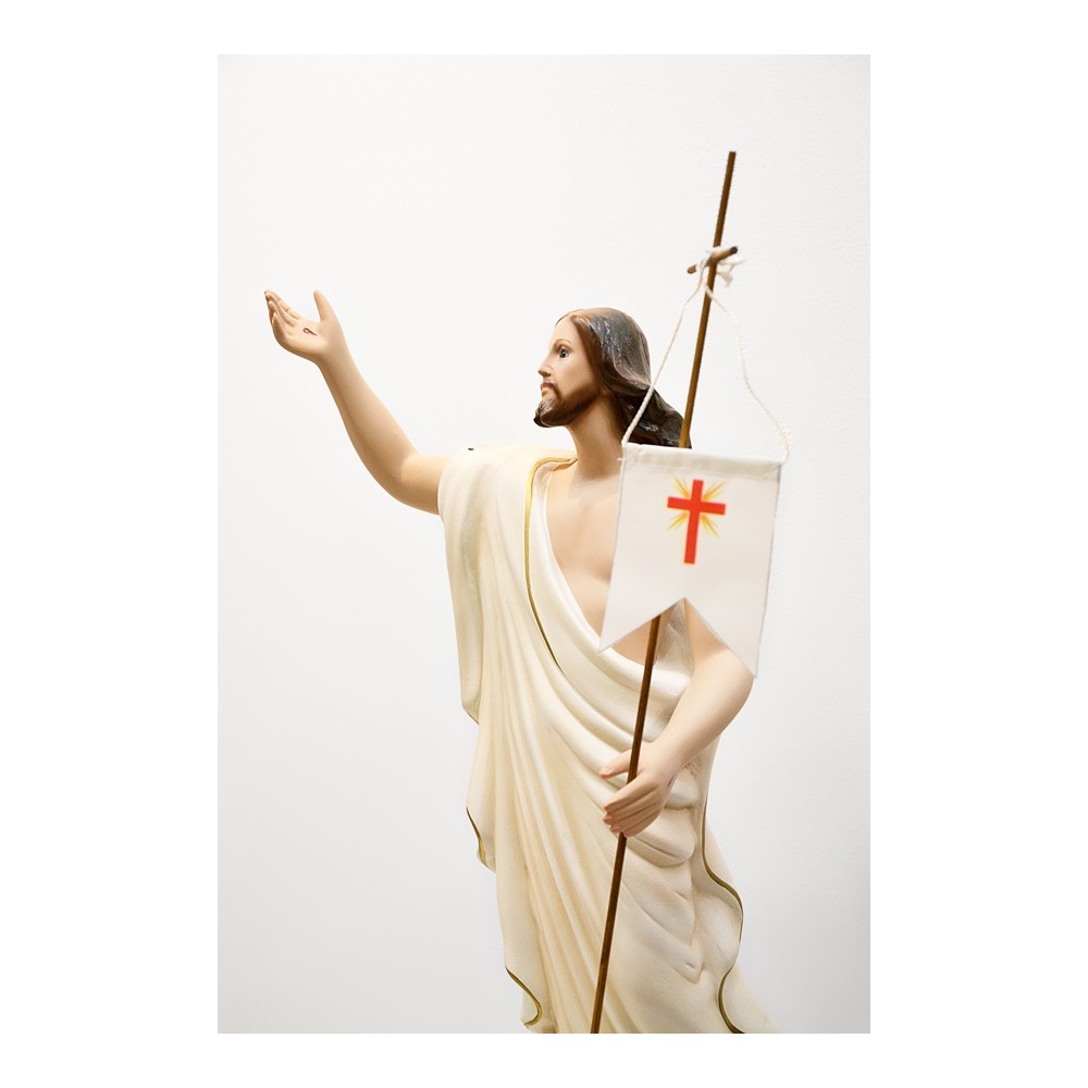 Statua di Gesù Risorto in vetro resina, materiale leggero, facilmente restaurabile in caso di rottura e resistente alle intemperie, quindi ideale per chiese, cappelle cimiteriali, giardini o qualsiasi altro ambiente. Questo simulacro della Resurrezione è dipinto interamente a mano, con applicazione di occhi in cristallo che lo rendono particolarmente espressivo. Made in Italy.