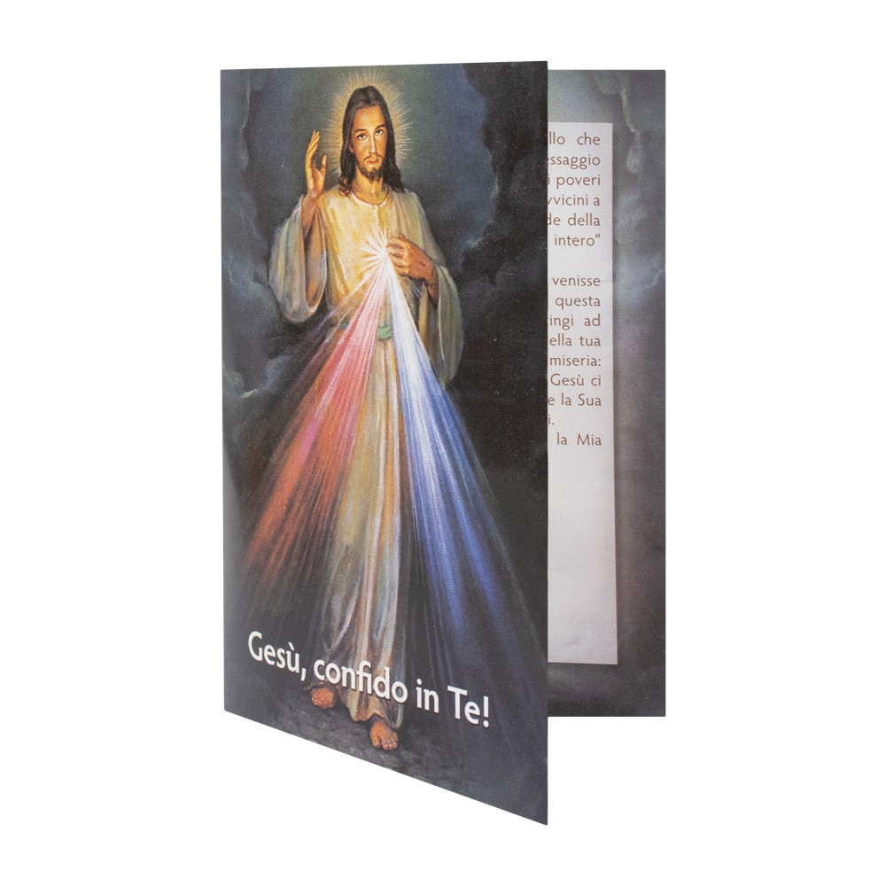 Piccola statua in legno sagomato raffigurante Gesù Misericordioso arricchita con dettagli in oro a caldo.