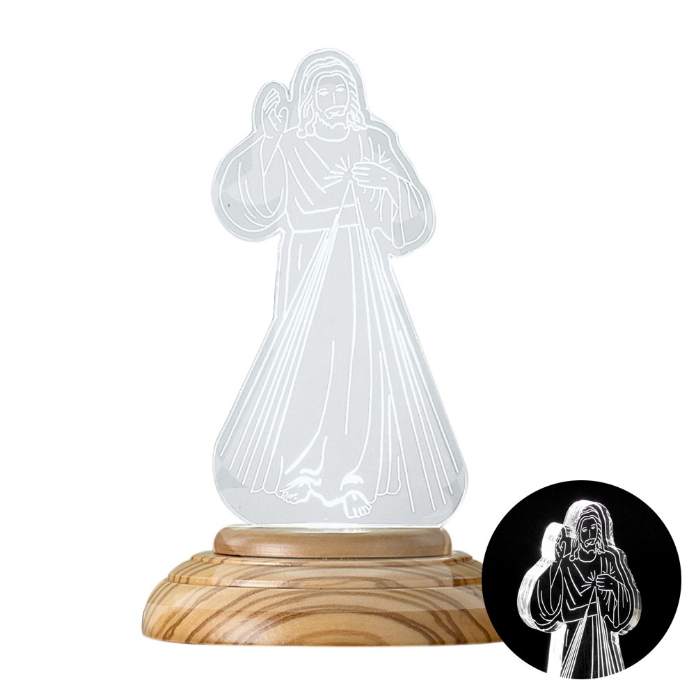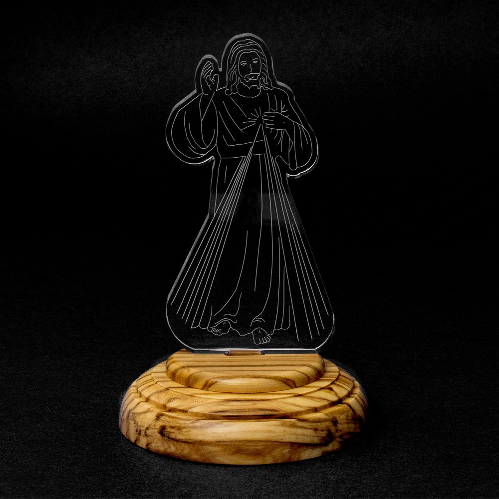 La sagoma è interamente in plexiglass, mentre la base è in legno di ulivo nazionale, su di essa è posizionata una piccola luce LED con interruttore che illumina la statua.
