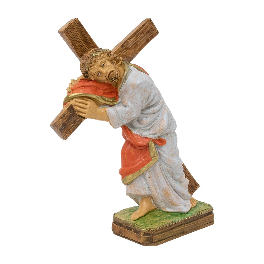Statua sacra raffigurante Gesù che porta la croce in spalla, alta circa 13 cm, dipinta mano con colorazione tipo legno.