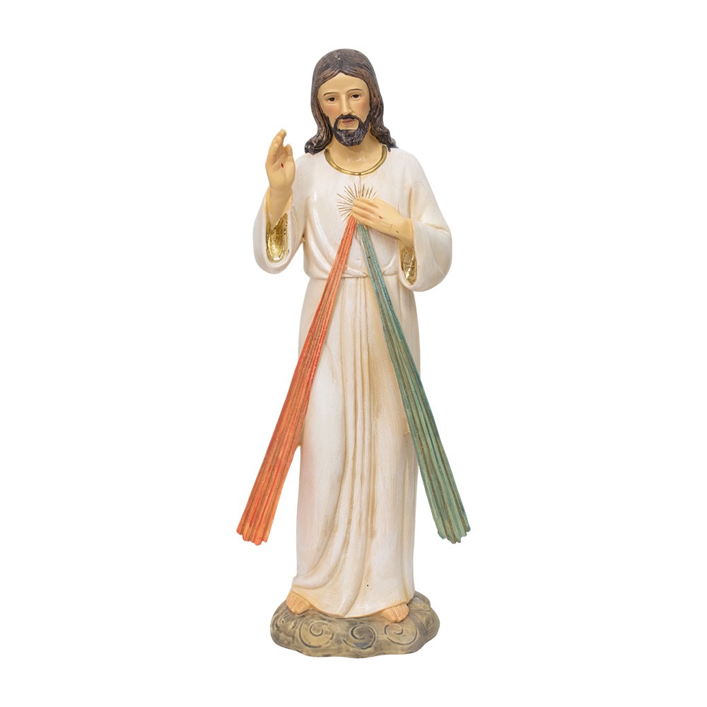 Statua di Gesù Misericordioso alta circa 30 cm prodotta interamente in resina colorata.
