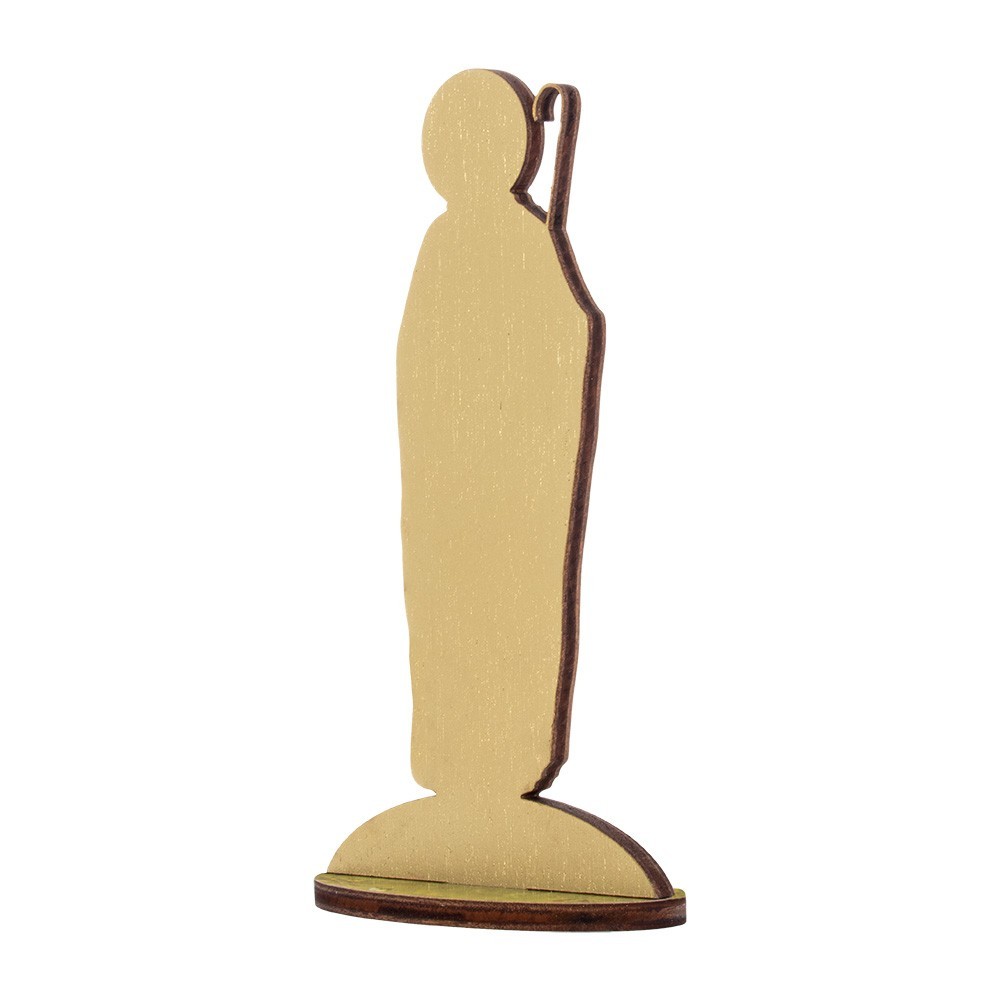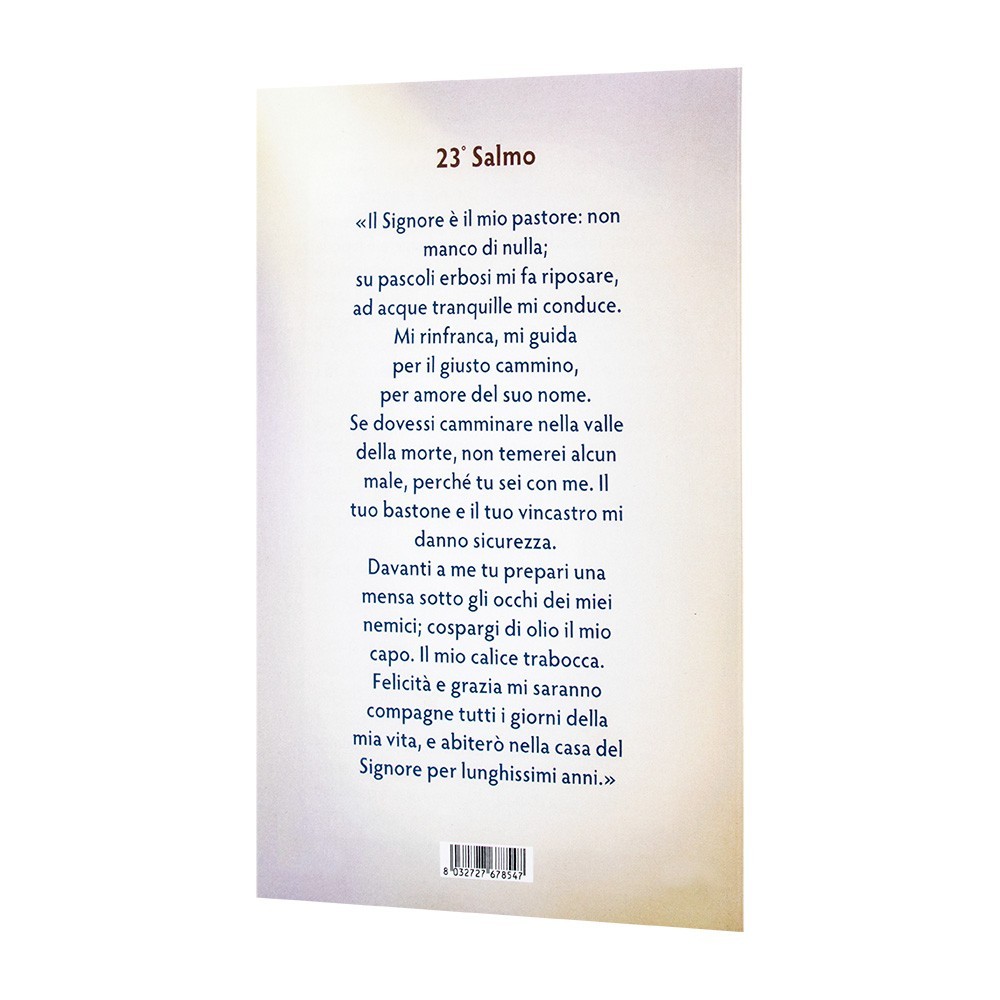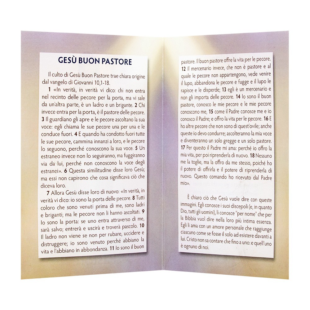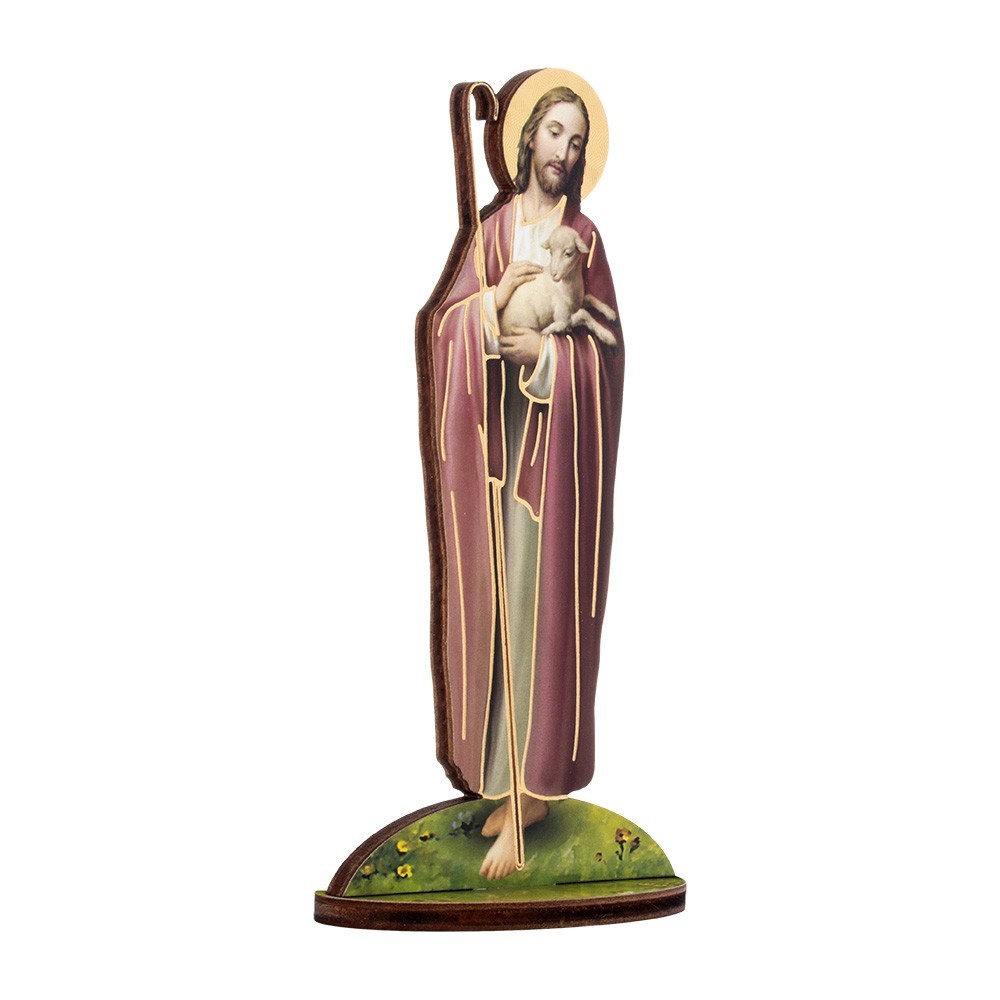 Statua di Gesù Buon Pastore. Questa statuetta è con immagine sagomata interamente in legno con appoggio. Ogni statua è confezionata singolarmente in bustina trasparente. All'interno della confezione vi è un foglietto pieghevole con IL 23_ Salmo e relativa biografia.