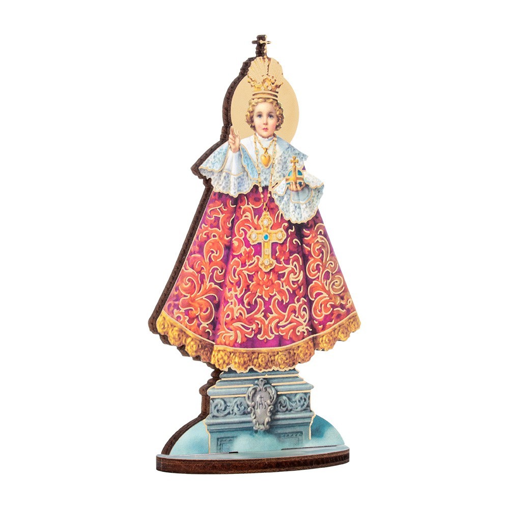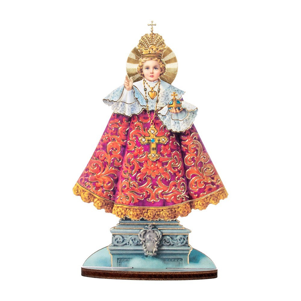 Immagine Sagomata in Legno del Santo Bambino di Praga. La statua è realizzata con base in legno. Confezionata singolarmente in bustina trasparente. All'interno della confezione vi è un foglietto pieghevole con preghiera del Santo e relativa biografia.
