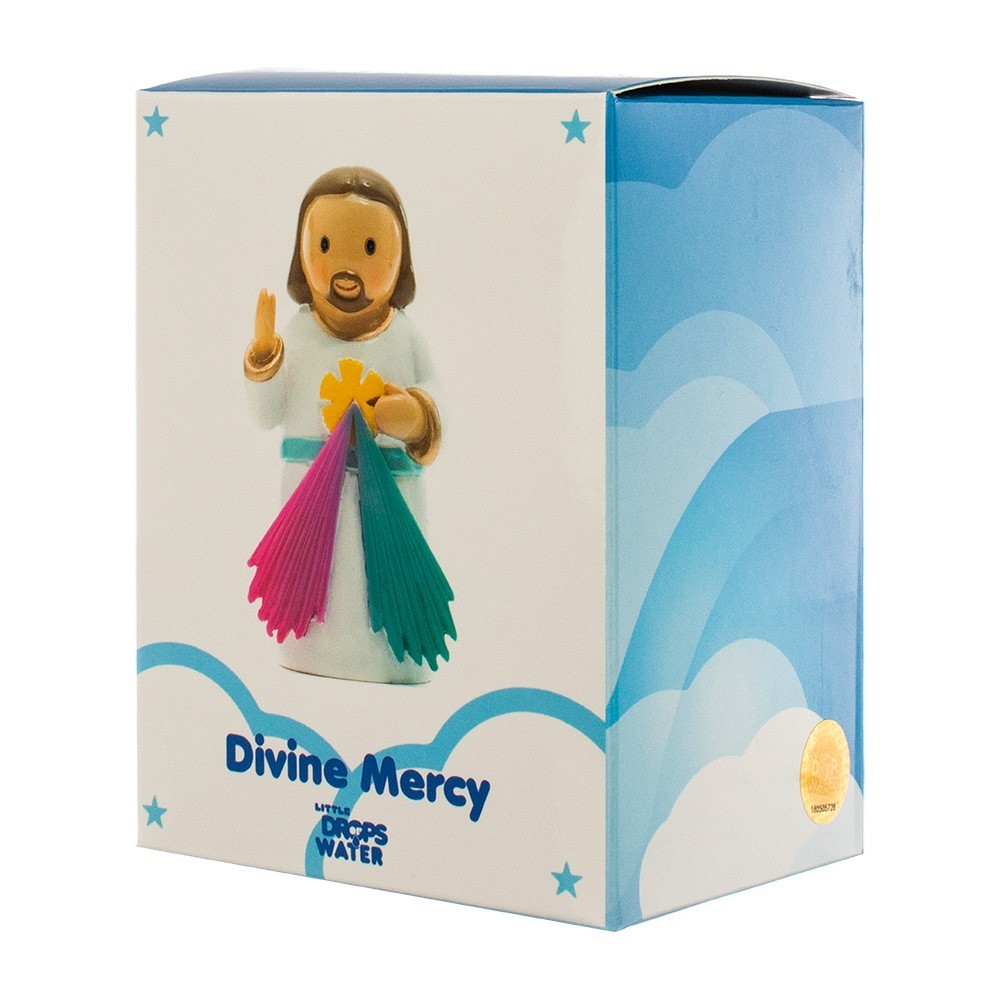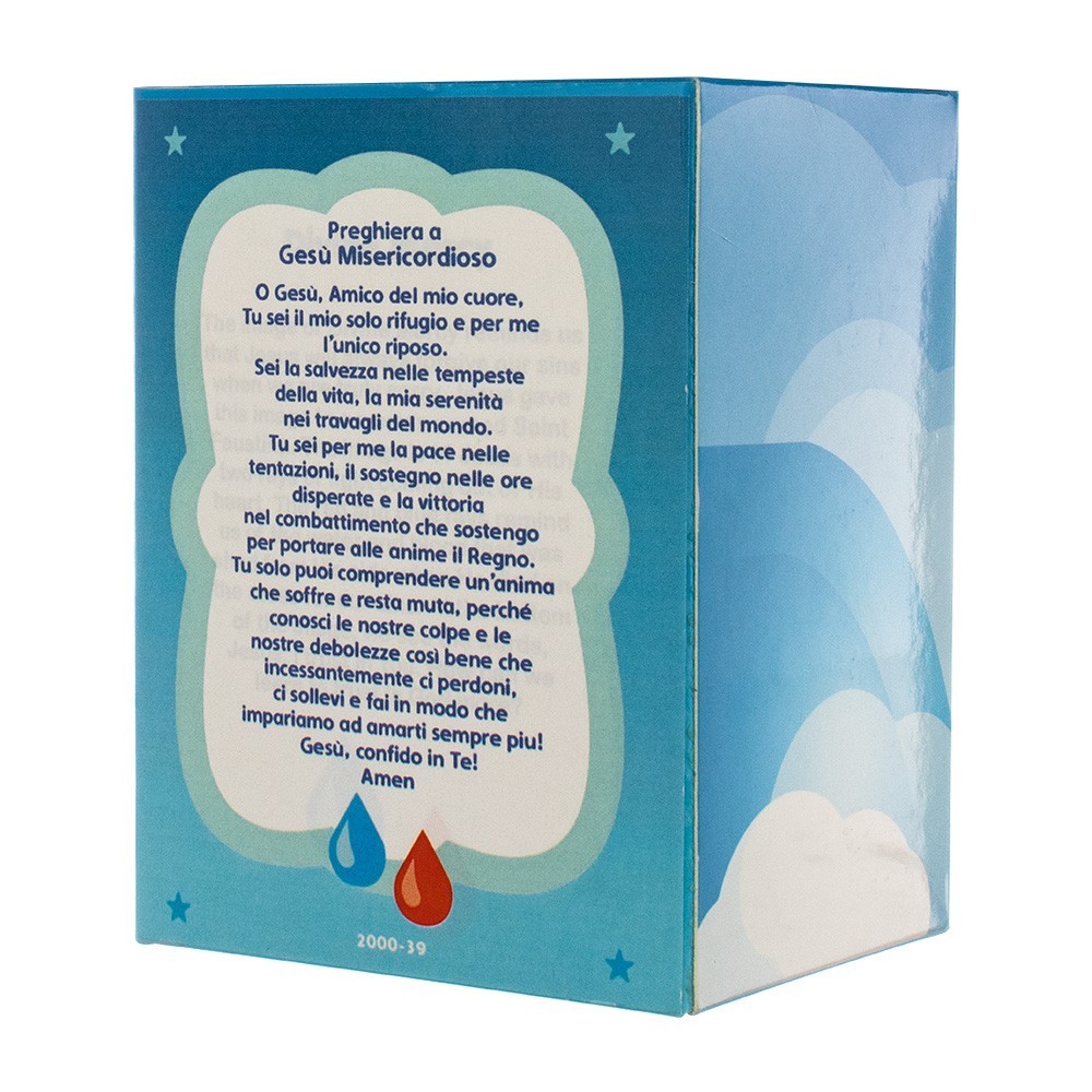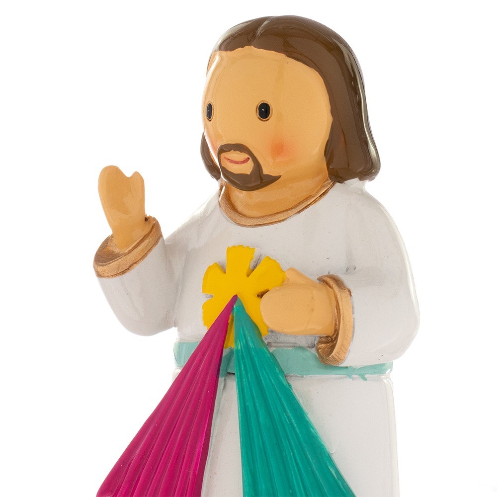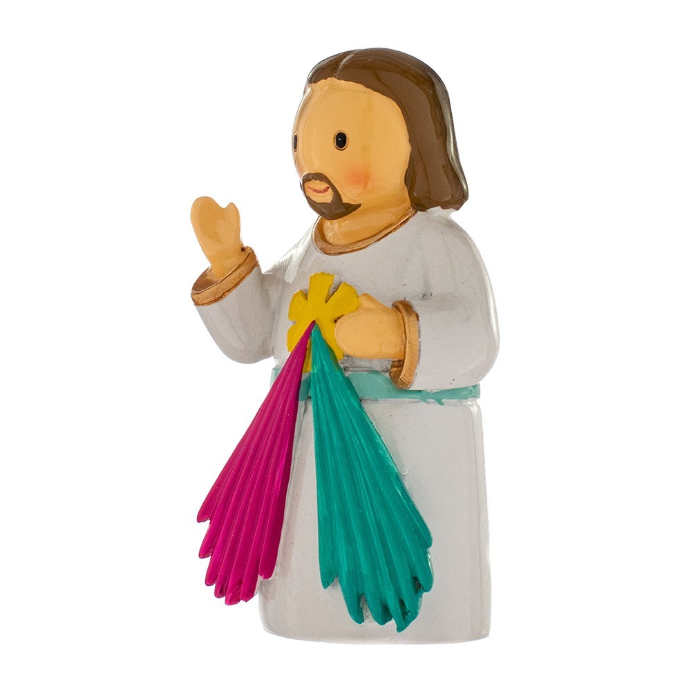Statua Gesù Misericordioso, alta 7,5 cm. Realizzata in resina colorata e dipinta interamente a mano. La statuetta viene confezionata in una carinissima scatola con immagine di Gesù e Preghiera sul retro.
