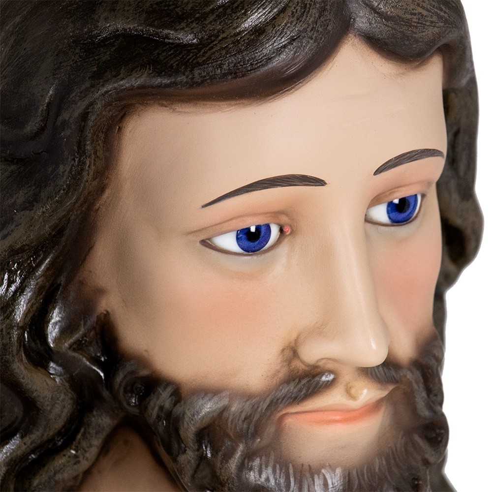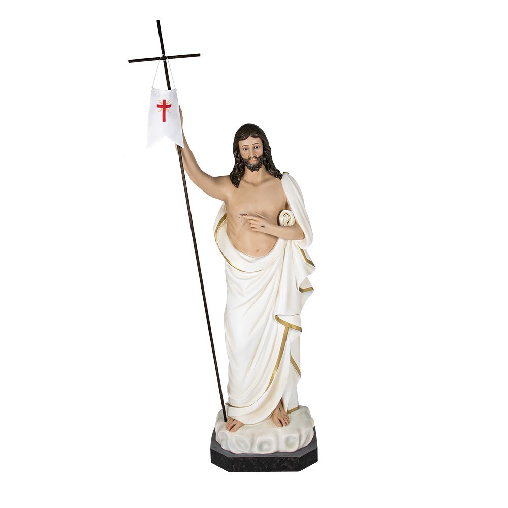 Statua di Gesù Risorto in vetroresina (Fiberglass), materiale leggero, facilmente restaurabile in caso di rottura e resistente alle intemperie, quindi ideale per chiese, cappelle cimiteriali, giardini o qualsiasi altro ambiente. Questo simulacro della Resurrezione è dipinto interamente a mano, con applicazione di occhi in cristallo che lo rendono particolarmente espressivo.