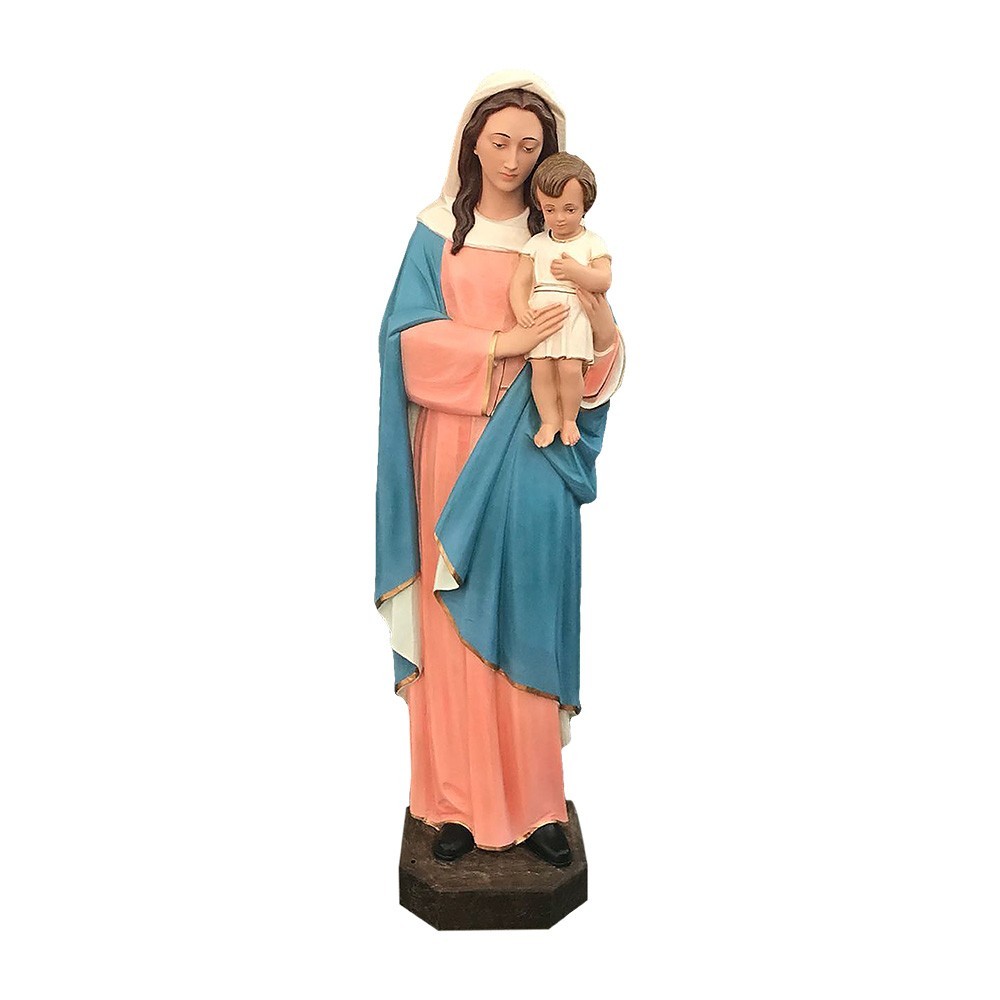 Questa statua della Madonna con Bambino è alta 145 cm. La stataua è realizzata in vetroresina, un materiale leggero e resistente agli urti e alle intemperie, quindi adatto anche per l'esterno. Dipinta interamente a mano.