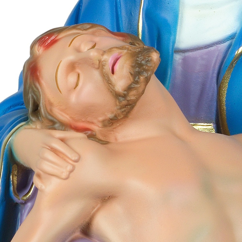 Statua prodotta in gesso raffigurante la scena della Pietà. Nella scena della Pietà, Maria è seduta e tiene tra le braccia Gesù.