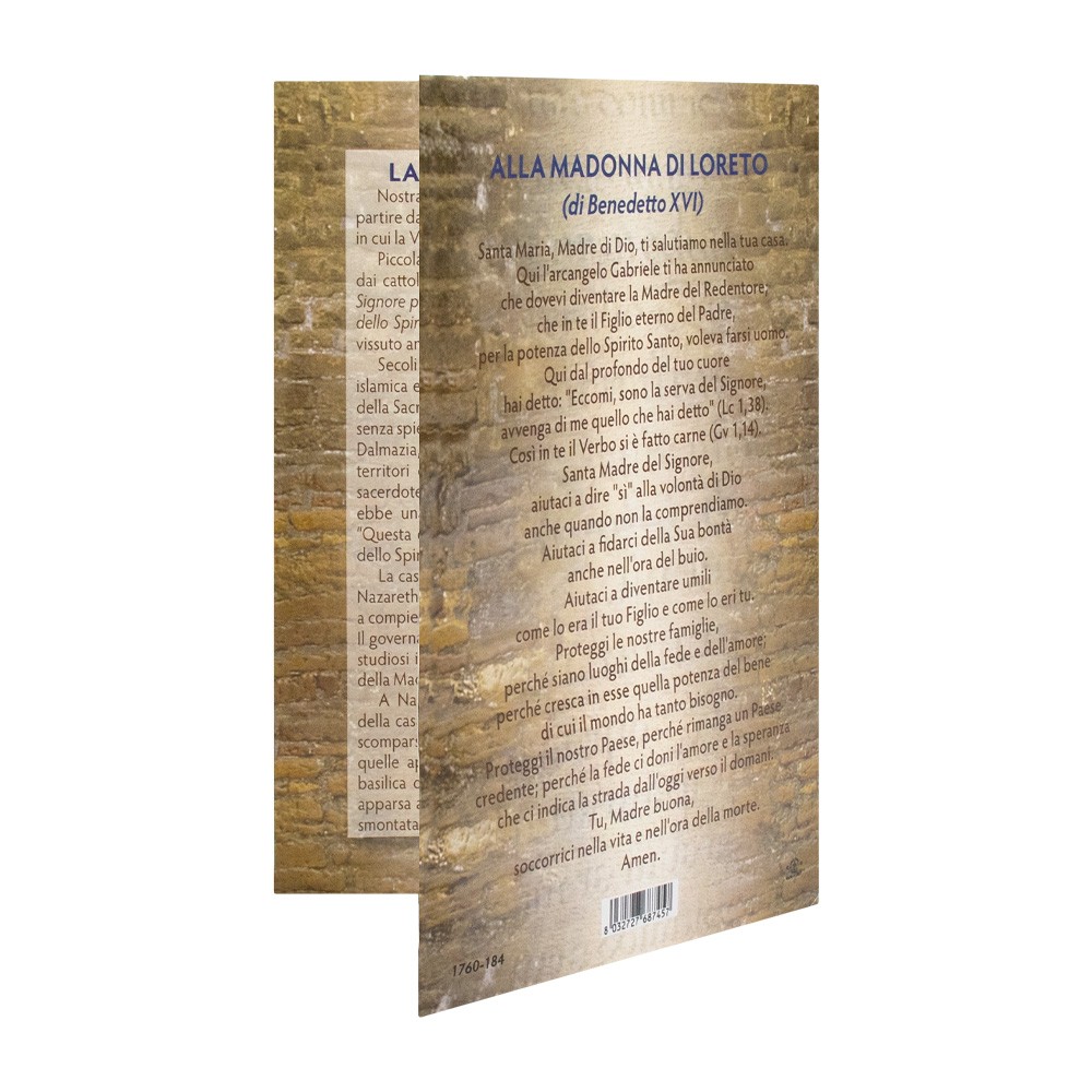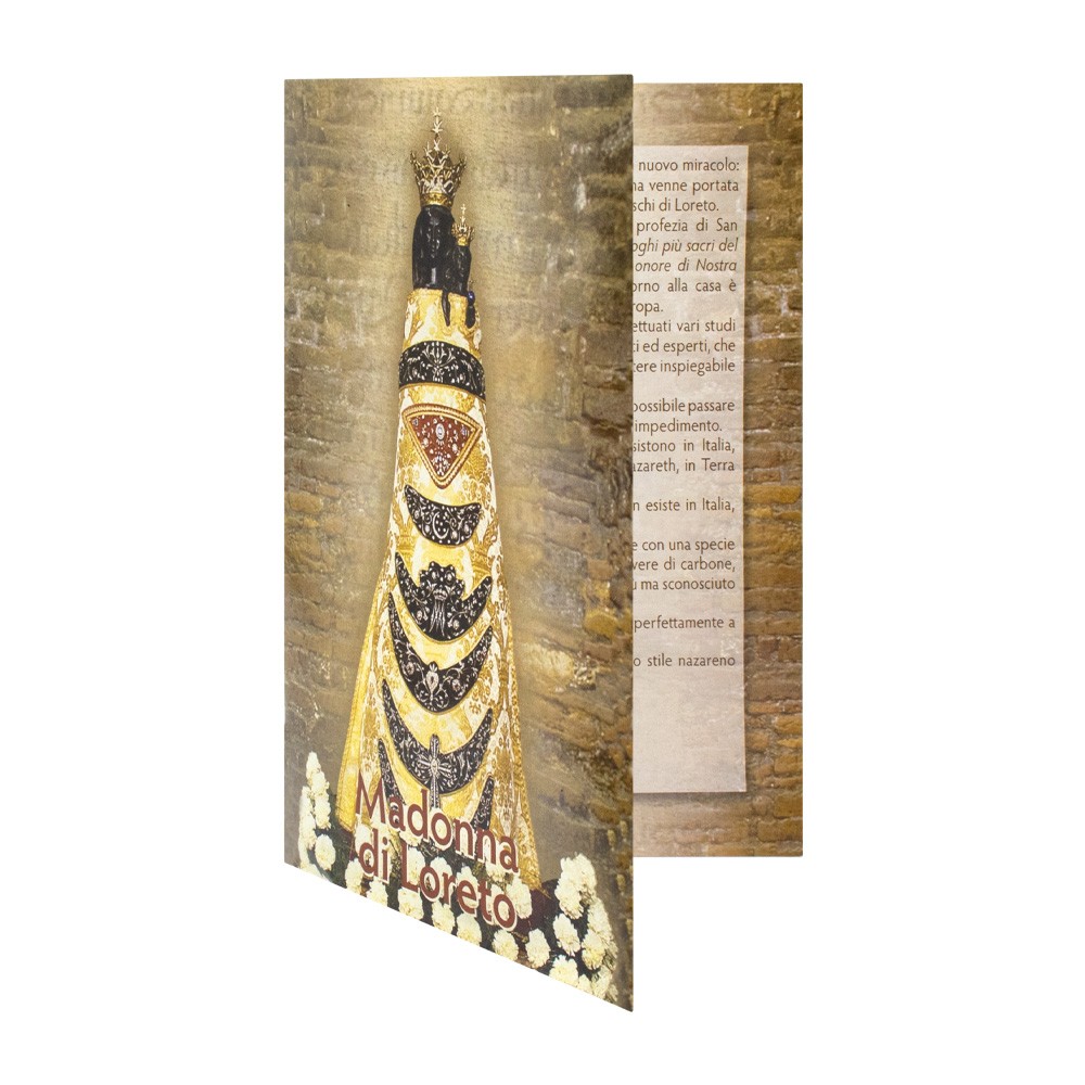 Statua sacra con sagoma in legno raffigurante la Madonna di Loreto arricchita con dettagli in oro a caldo.