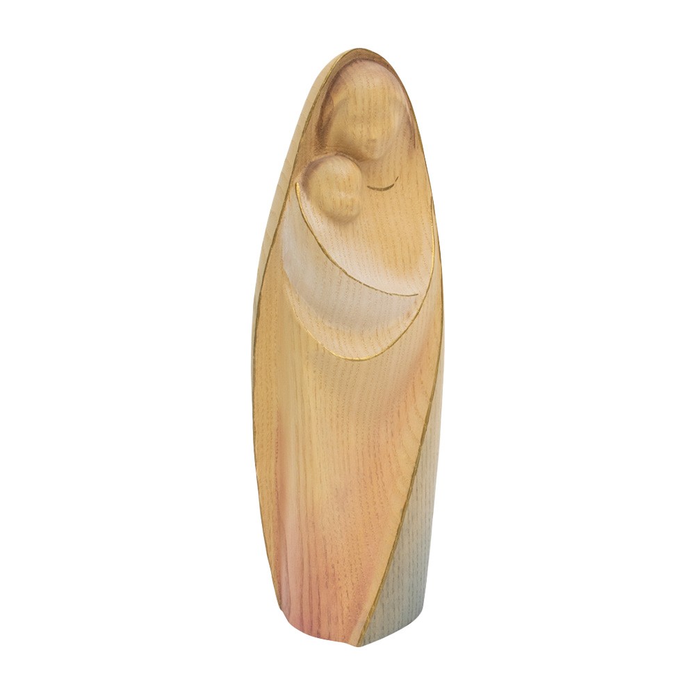 Meravigliosa statuetta della Madonna della Gioia, alta 22,5 cm, realizzata in legno di frassino e dipinta con colori ad acquarello con venature visibili, impreziosita con foglia oro ossidata.