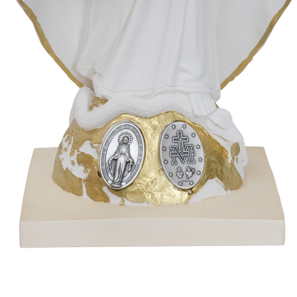 La statua è realizzata interamente in resina dipinta bianca, con base e medaglia Miracolosa in metallo color argento.