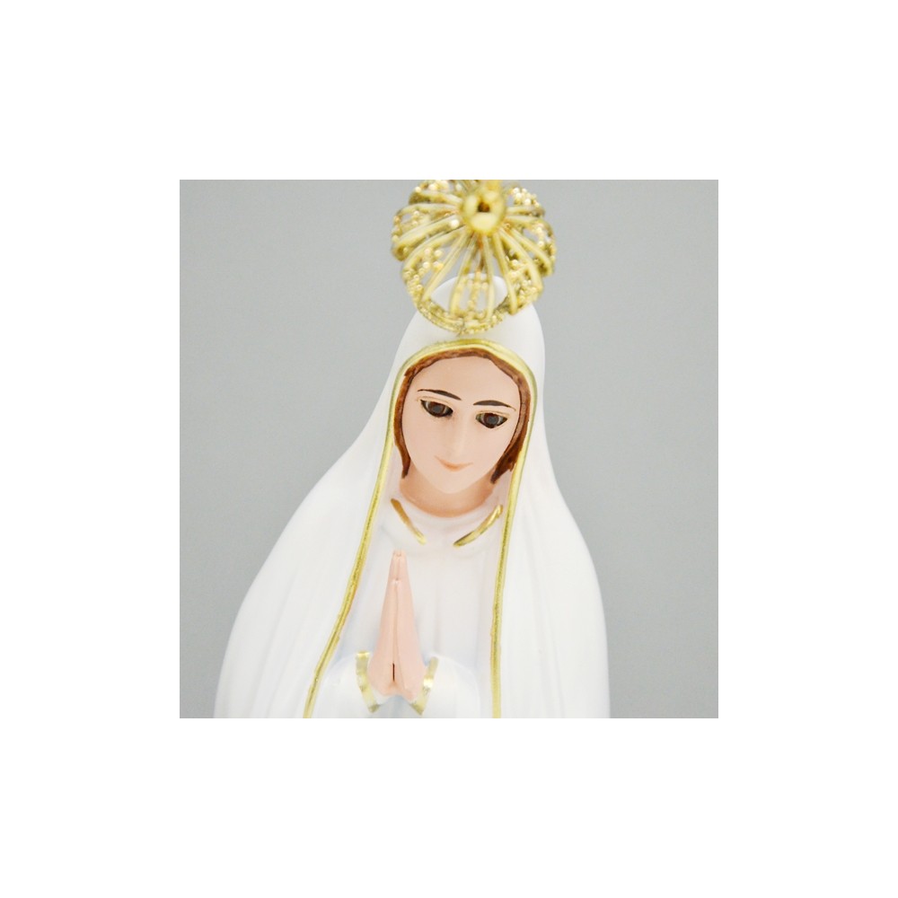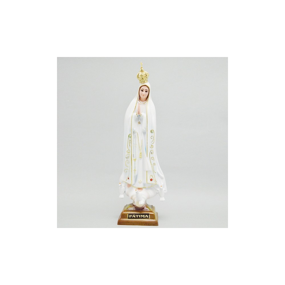 Statua Madonna di Fatima con Colombe realizzata in resina. Dipinta a mano con occhi in vetro per renderla ancora più espressiva. Scatolata.