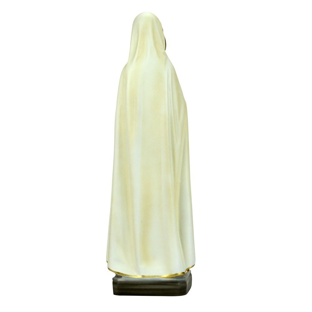 La statua è alta 30 cm, raffigurata con una veste di colore bianco, mani giunte in preghiera e tre rose sul manto, bianca, rossa e gialla.