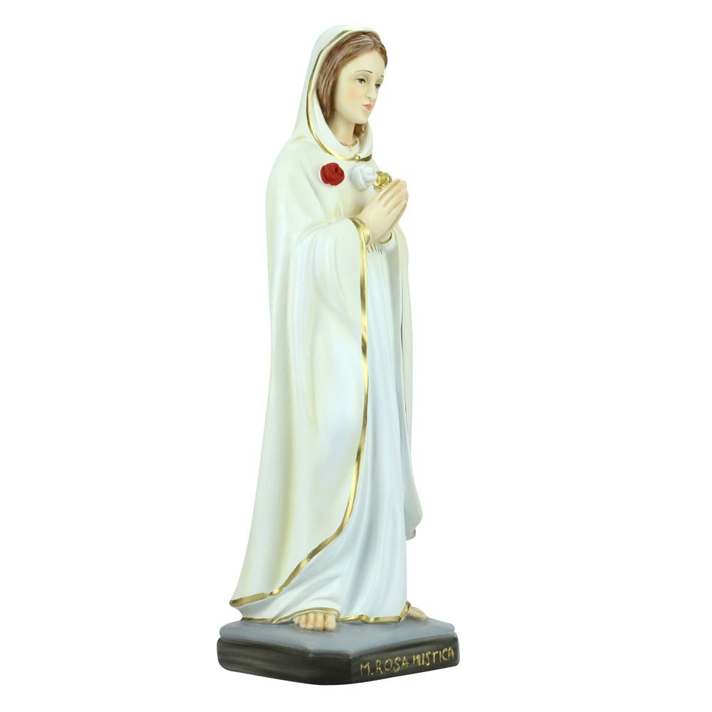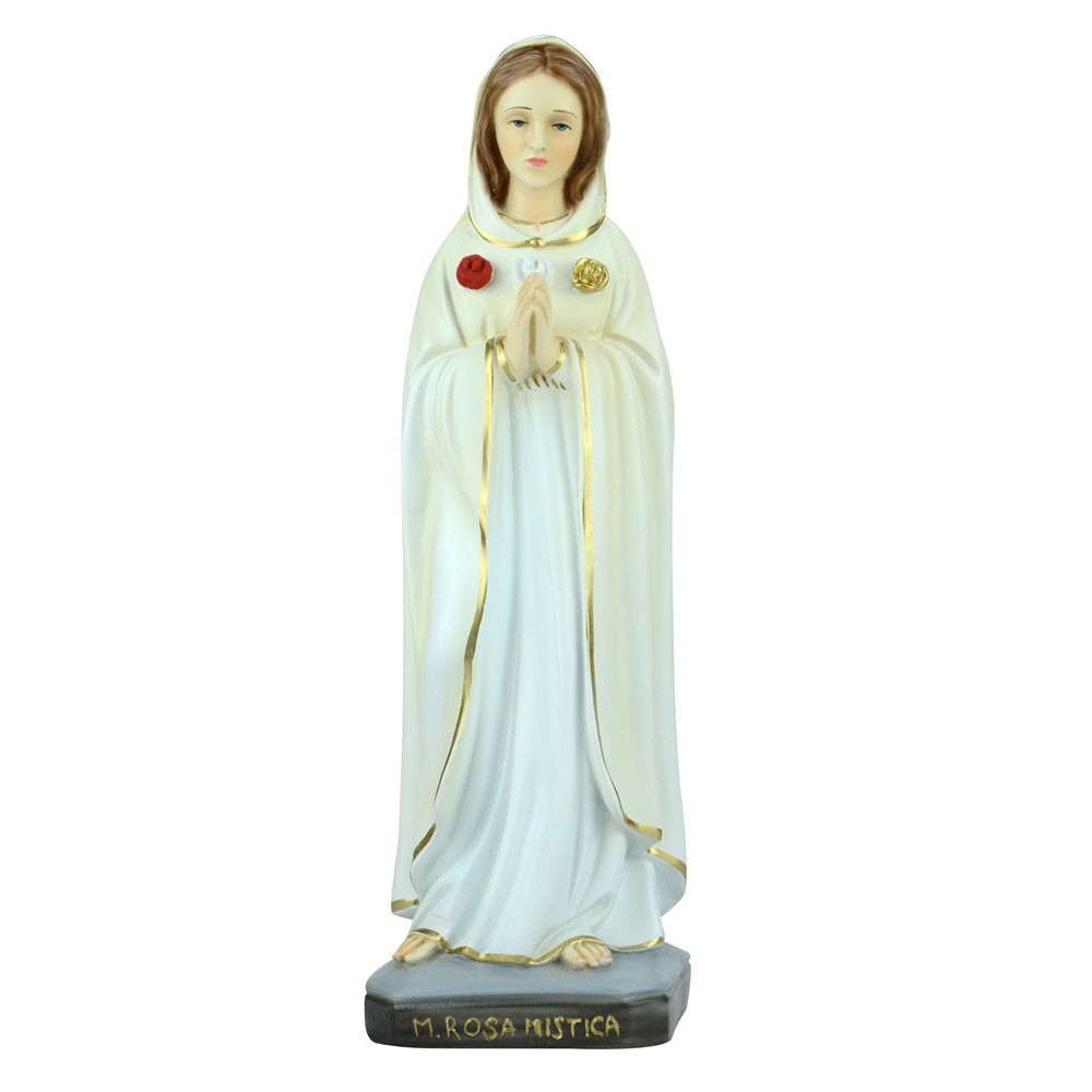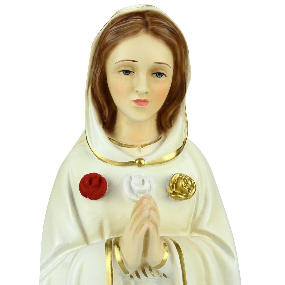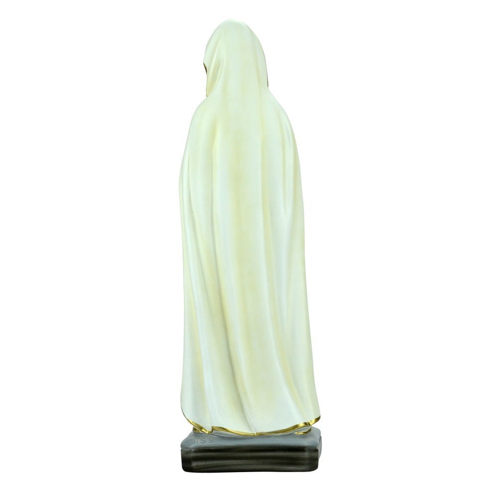 La statua è alta 38 cm, raffigurata con una veste di colore bianco, mani giunte in preghiera e tre rose sul manto, bianca, rossa e gialla.